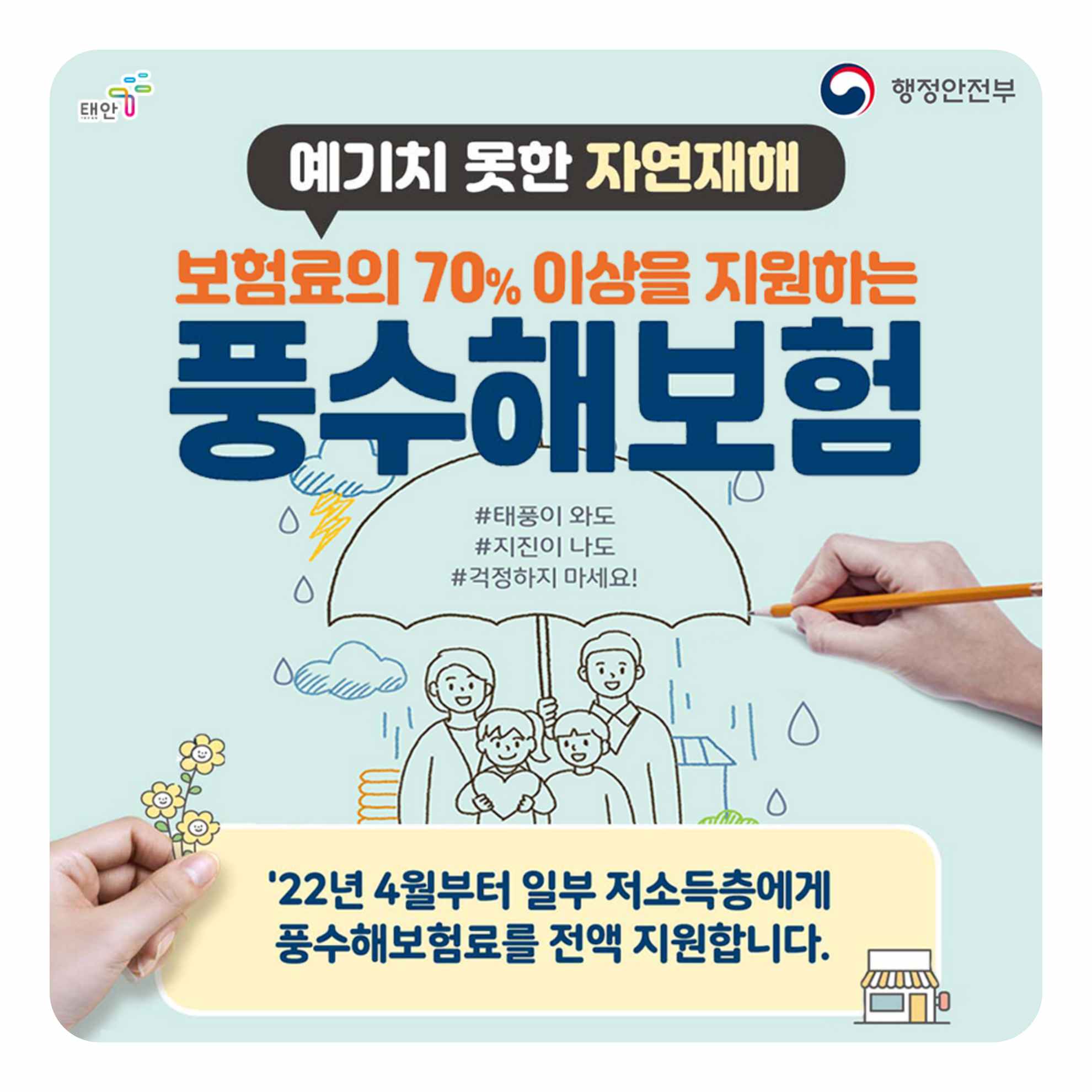 재난 상황에 대비하여 미리 풍수해보험을 검토하고 가입하시는 것을 권장드립니다.
