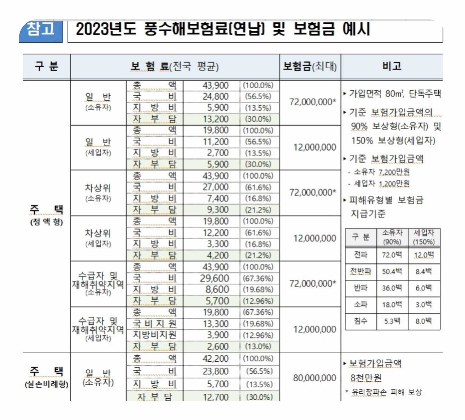| 주택·온실 풍수해보험(I) | 주택, 온실 | 개별 | 일반: 52.592%, 차상위: 75~92%, 기초수급: 86.25~92% |
