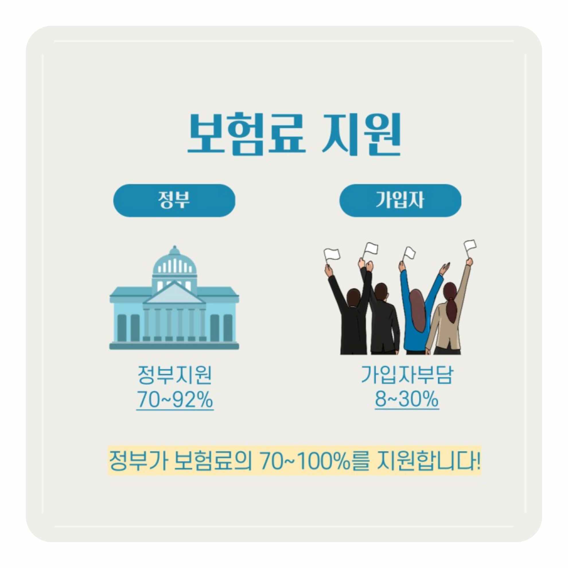 특히 저소득층은 최대 92%까지 보험료를 지원받을 수 있어, 소득에 관계없이 누구나 안정적인 대비가 가능합니다.