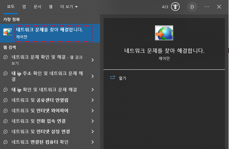 윈도우 검색창을 열고 "네트워크 문제 확인 및 해결"을 검색하여 해당 기능을 실행합니다.