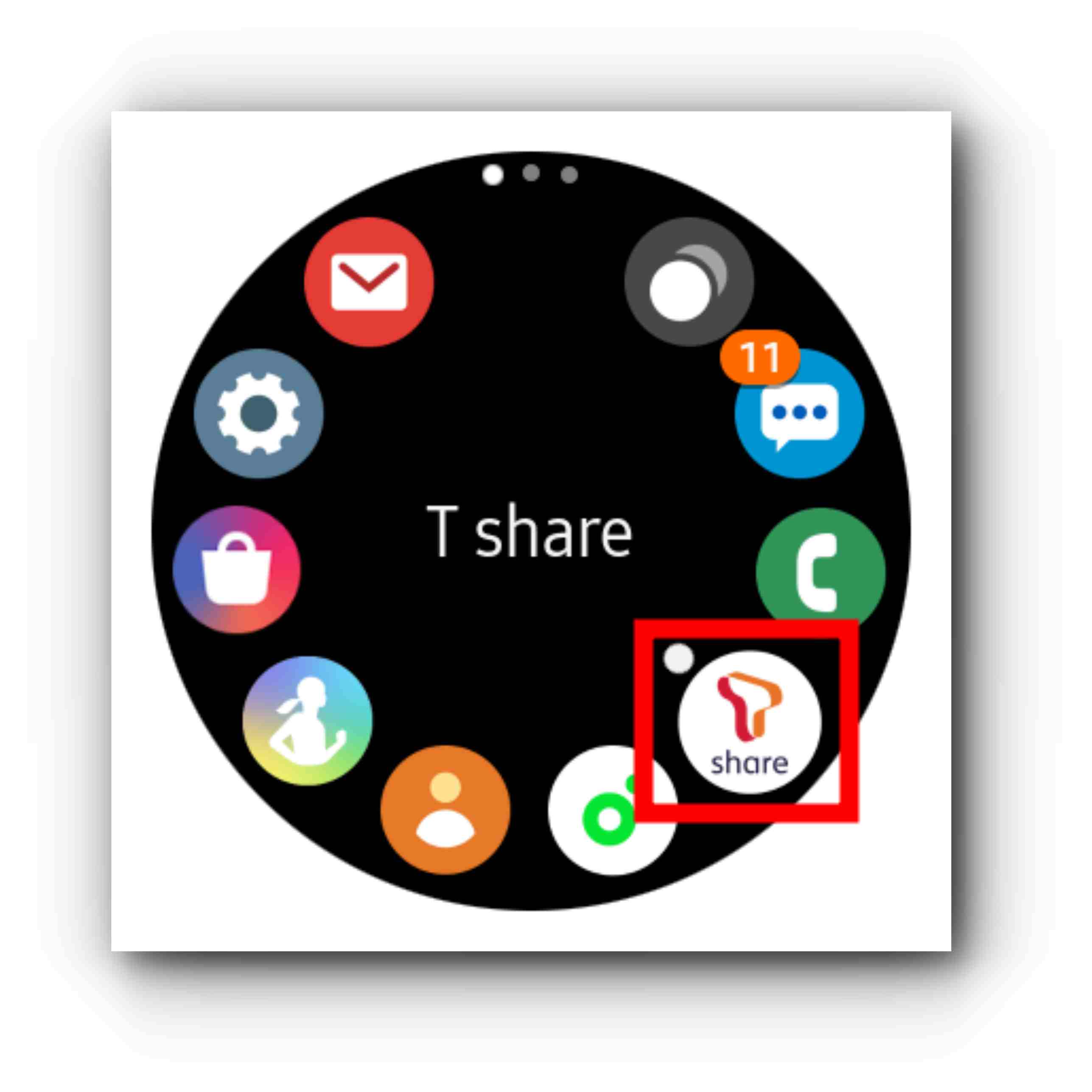 1. 갤럭시워치에서 T share 앱을 실행하고 오른쪽 상단의 '...' 버튼을 누릅니다.