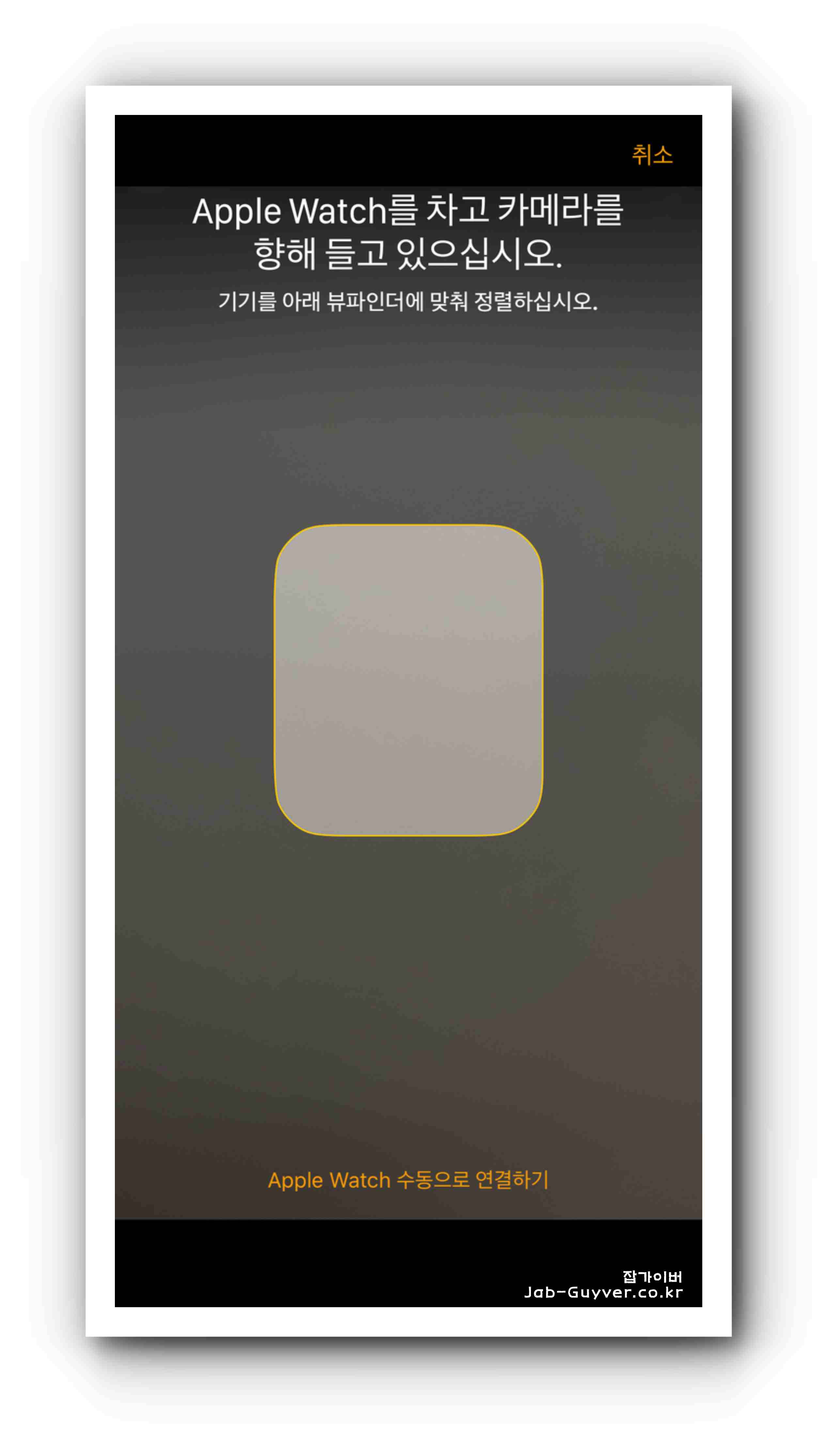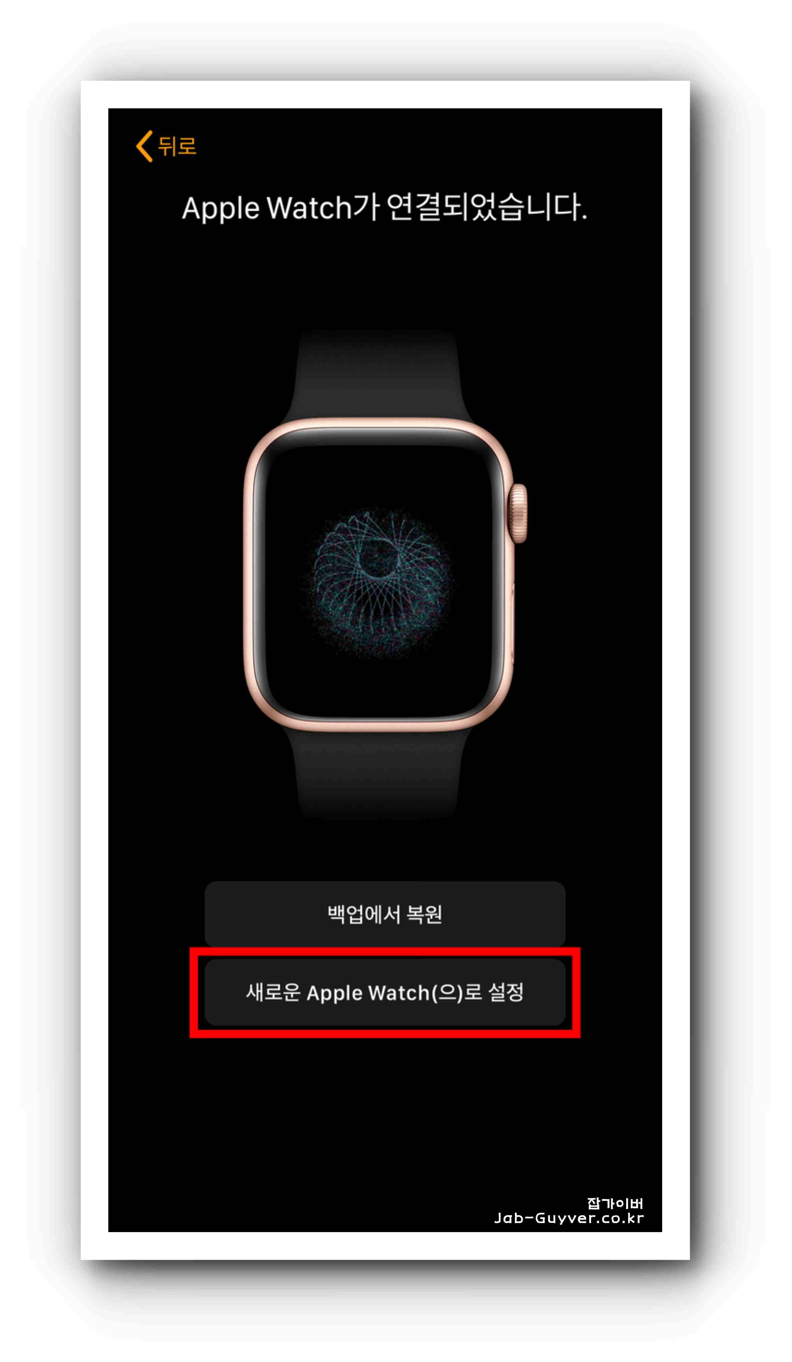 앱 화면의 네모칸에 애플워치를 맞춰 인식시키면 연결이 완료됩니다. 기존 사용자는 '백업에서 복원' 또는 '새로운 Apple Watch(으)로 설정'을 선택하여 진행합니다.