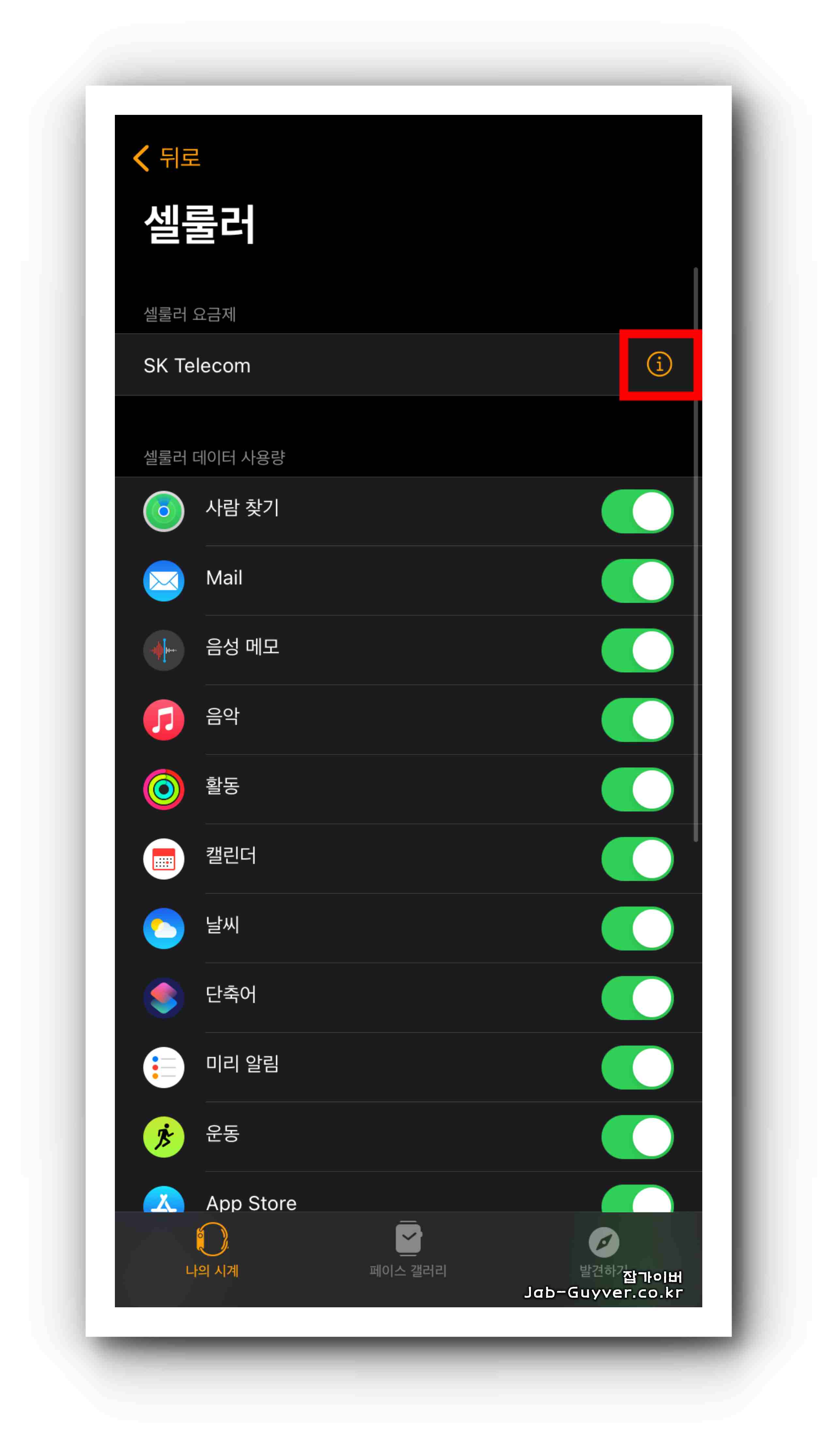 - 아이폰의 Watch 앱 실행 → 셀룰러로 이동 후 통신사 옆의 ⓘ 아이콘 선택