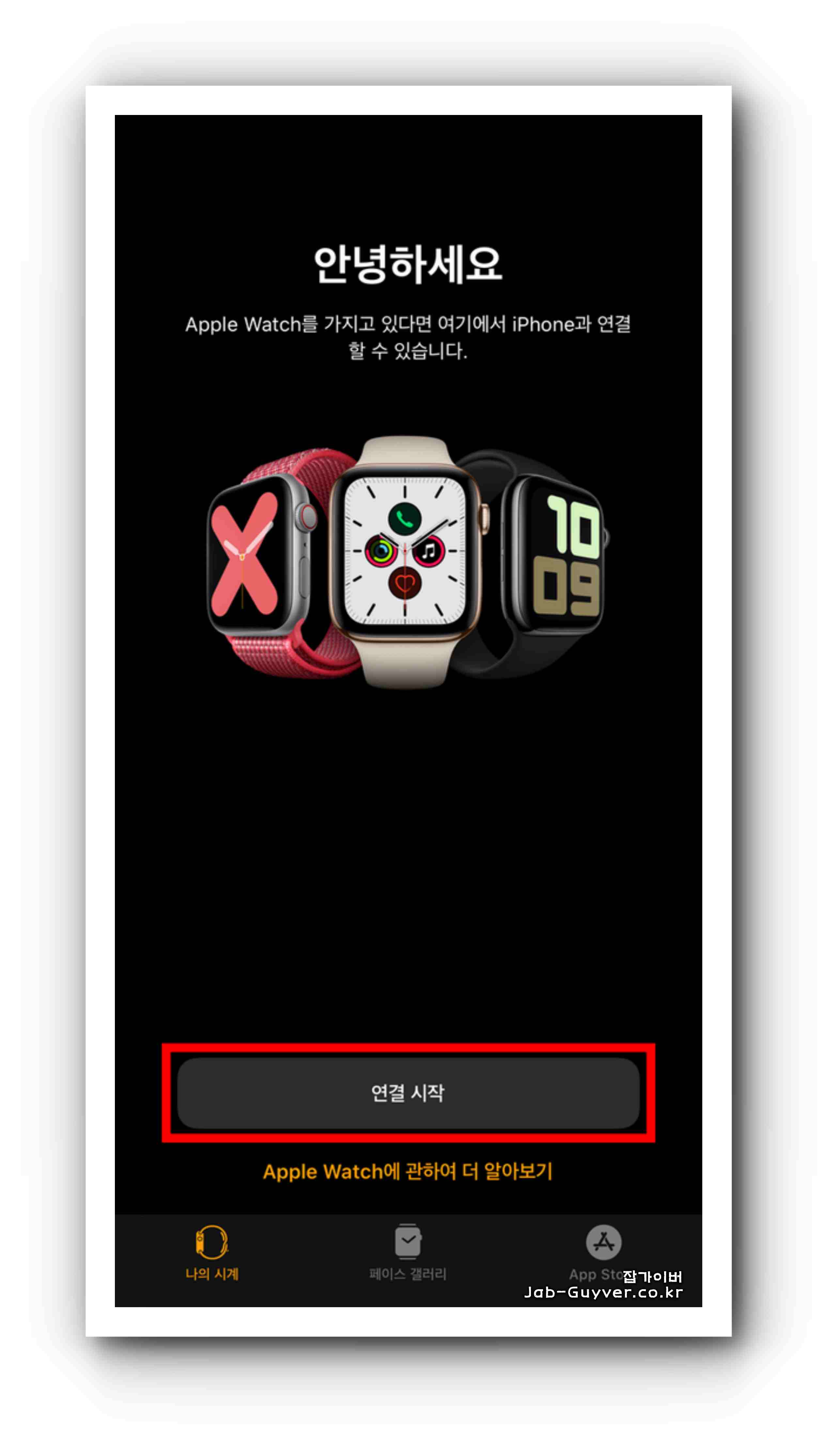 애플워치의 전원을 켜고, 화면에 나타나는 문구를 확인한 후 아이폰의 Watch 앱을 실행합니다.