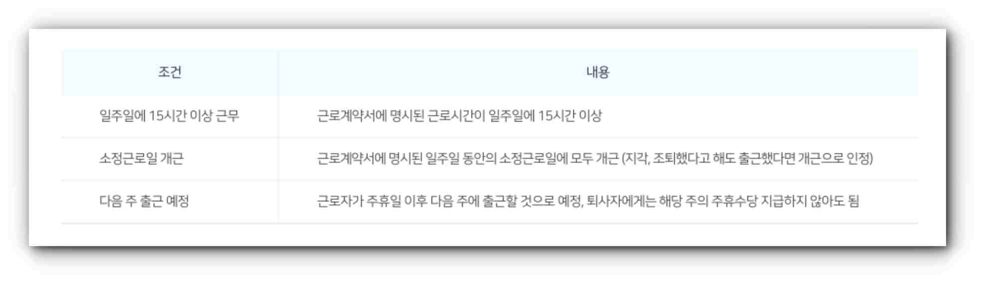 그리고 이러한 주휴수당은 정직원 회사 근로자들 외에도 아르바이트생도 주휴수당을 받을 수 있습니다. 하지만 주휴수당을 받기 위해서는 다음 조건들을 충족해야 합니다.