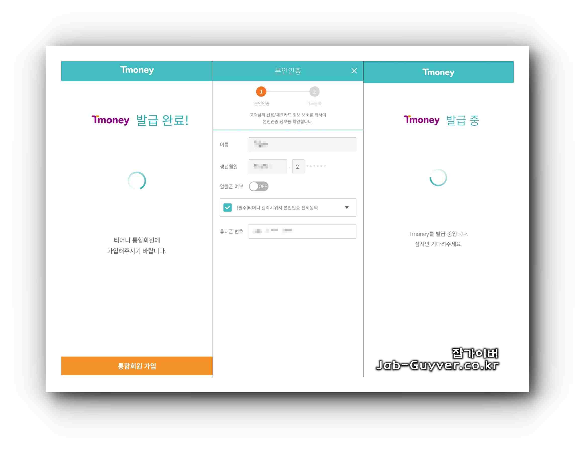 이후 티머니 발급을 위한 T-Money 통합회원을 가입해야합니다.