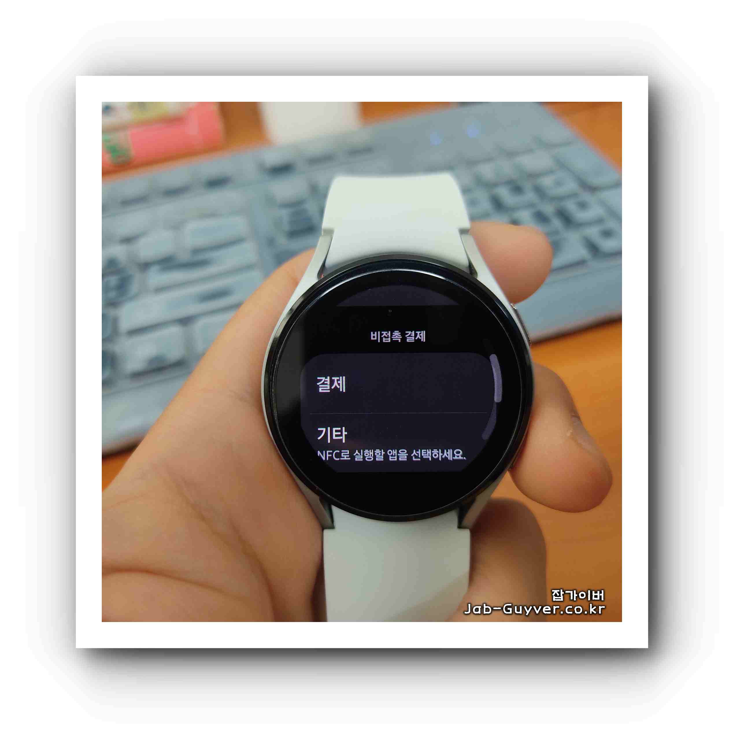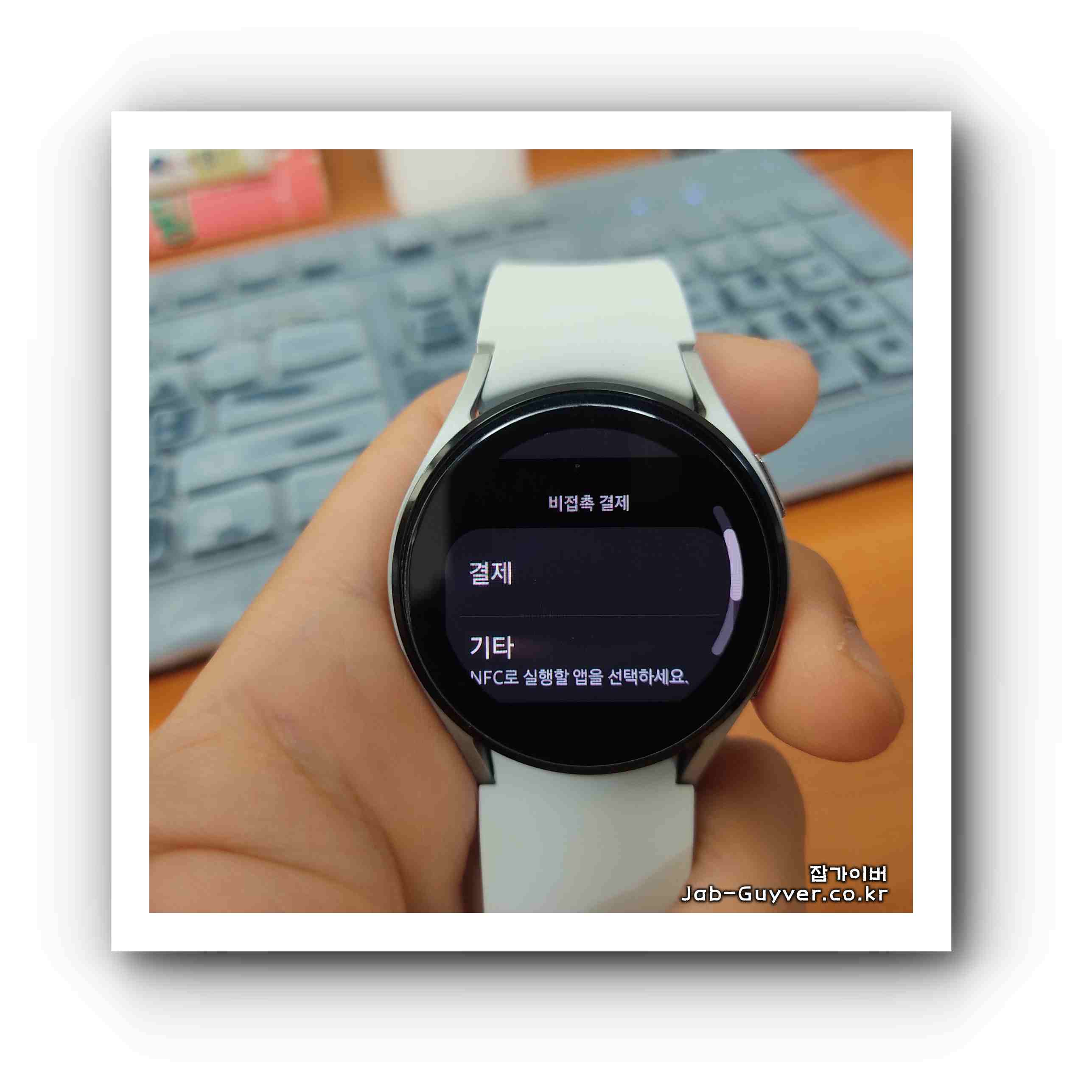 티머니 갤럭시워치 활성화 하면 워치 윕 부분을 리더기에 가져다 되면 자동으로 결제가 됩니다.