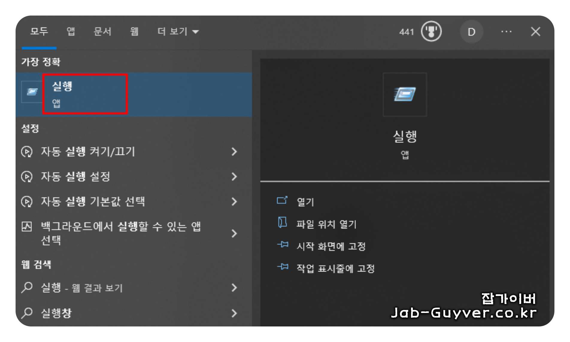 시작 메뉴에서 "실행"을 검색하여 실행창을 엽니다.
