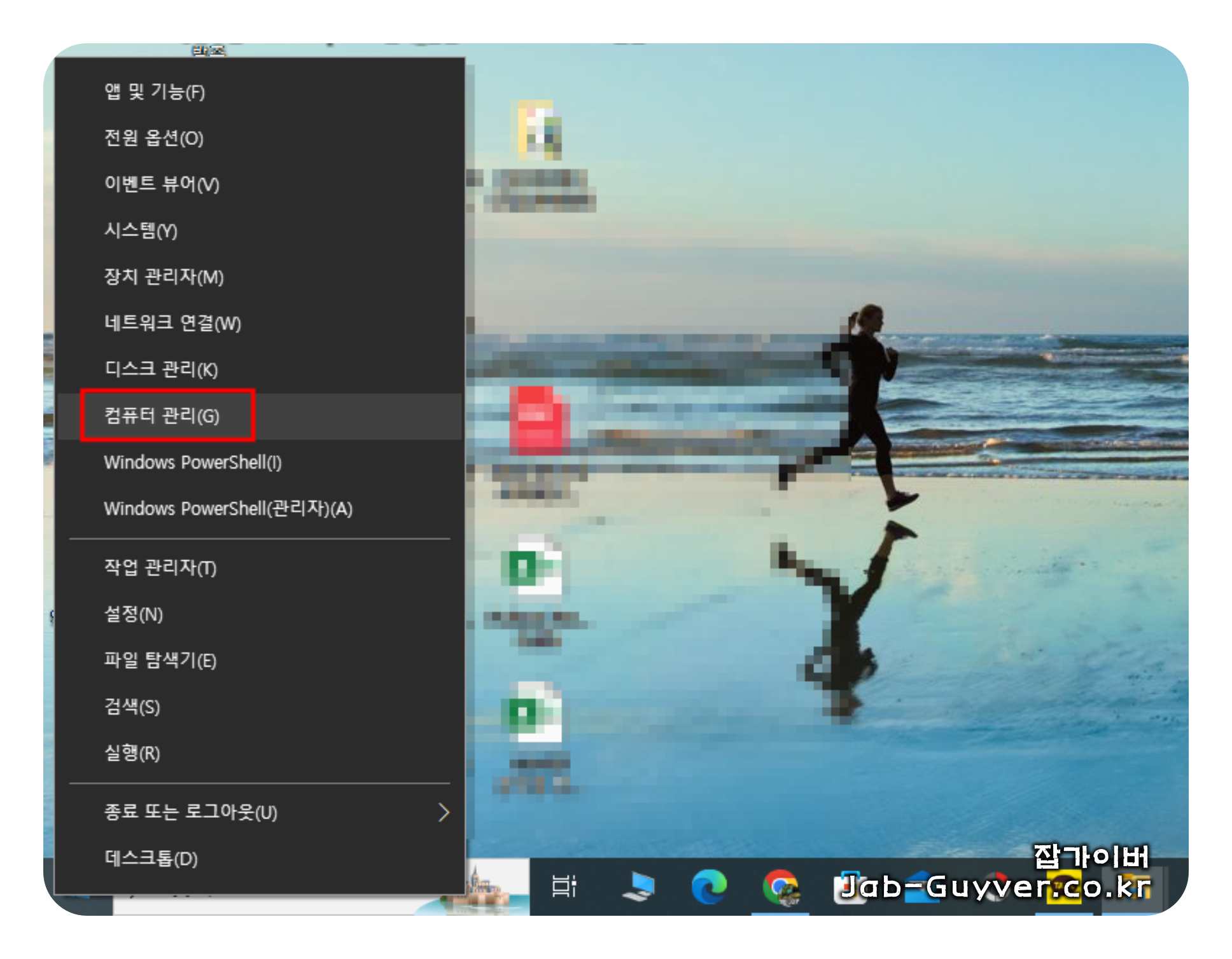 윈도우 아이콘 마우스 우클릭 후 "컴퓨터 관리" 선택합니다.