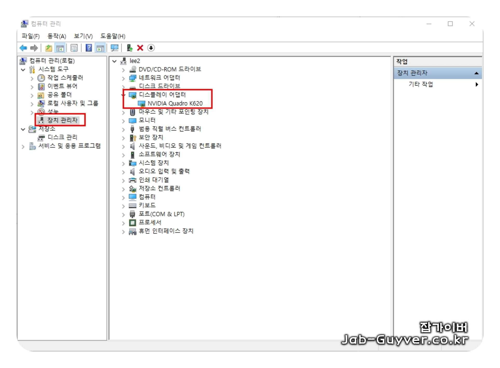 컴퓨터 관리 -> 장치 관리자 탭을 선택 후 "디스플레이 어댑터" 클릭하여 그래픽카드 모델 확인할 수 있으며 추가로 아래 정보를 더 확인가능합니다.
