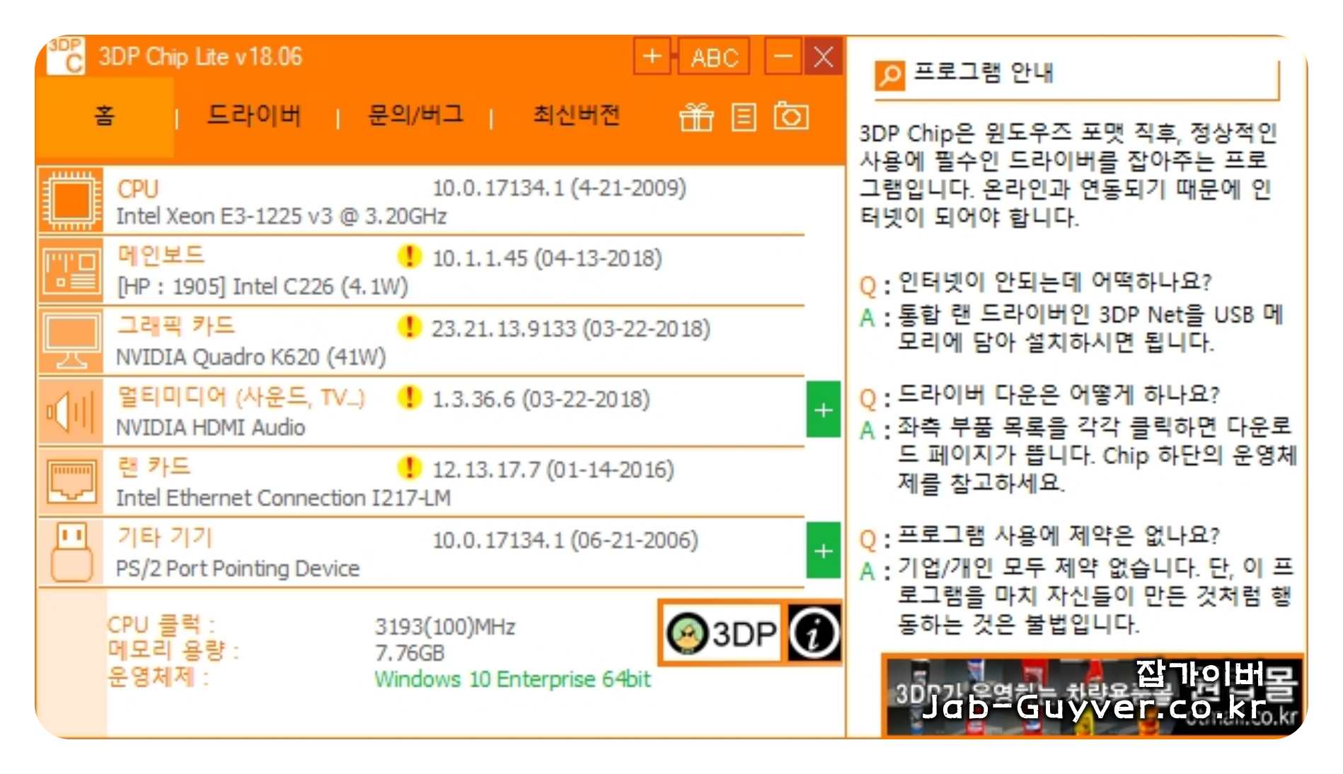 그 외에도 가장 추천하는 방법은 무료 프로그램인 3DP CHIP을 사용하는것으로 그래픽카드 모델명 뿐만 아니라 CPU, 메인보드, 사운드카드, 랜카드 등의 모델을 확인하고 디바이스를 설치해서 최신버전으로 자동 업데이트가 가능한 장점이 있습니다.