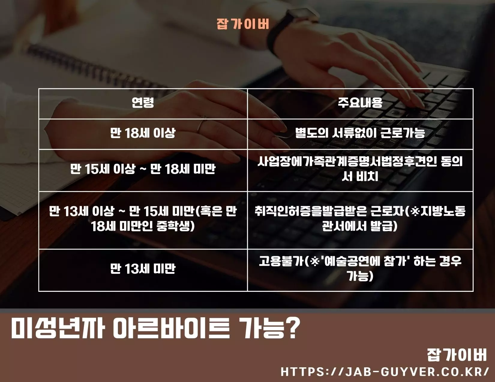 만 18세 미만의 미성년자는 일반적으로 아르바이트를 할 수 없습니다. 다만, 만 15세부터 18세까지는 부모님의 동의서가 있다면 아르바이트를 할 수 있습니다.