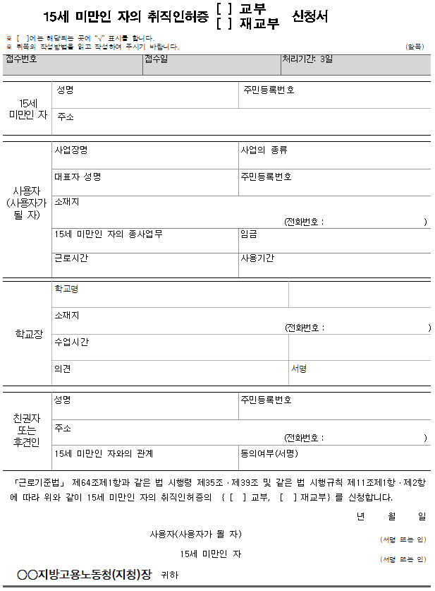 - 이 신청서에는 미성년자와 사용자(고용주, 사업주), 학교장, 친권자 또는 후견인의 서명 또는 인장이 필요합니다.
