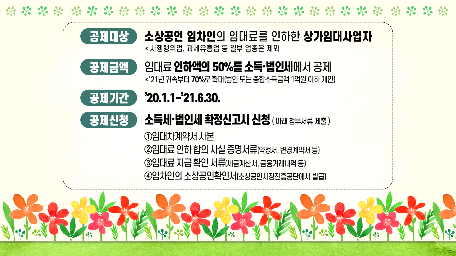 - 공제기간 : 제도는 2020년 1월 1일에 시작되었고, 연장 끝에 현재 2025년 12월 31일까지 인하한 임대료에 대해 세액공제를 받을 수 있습니다.