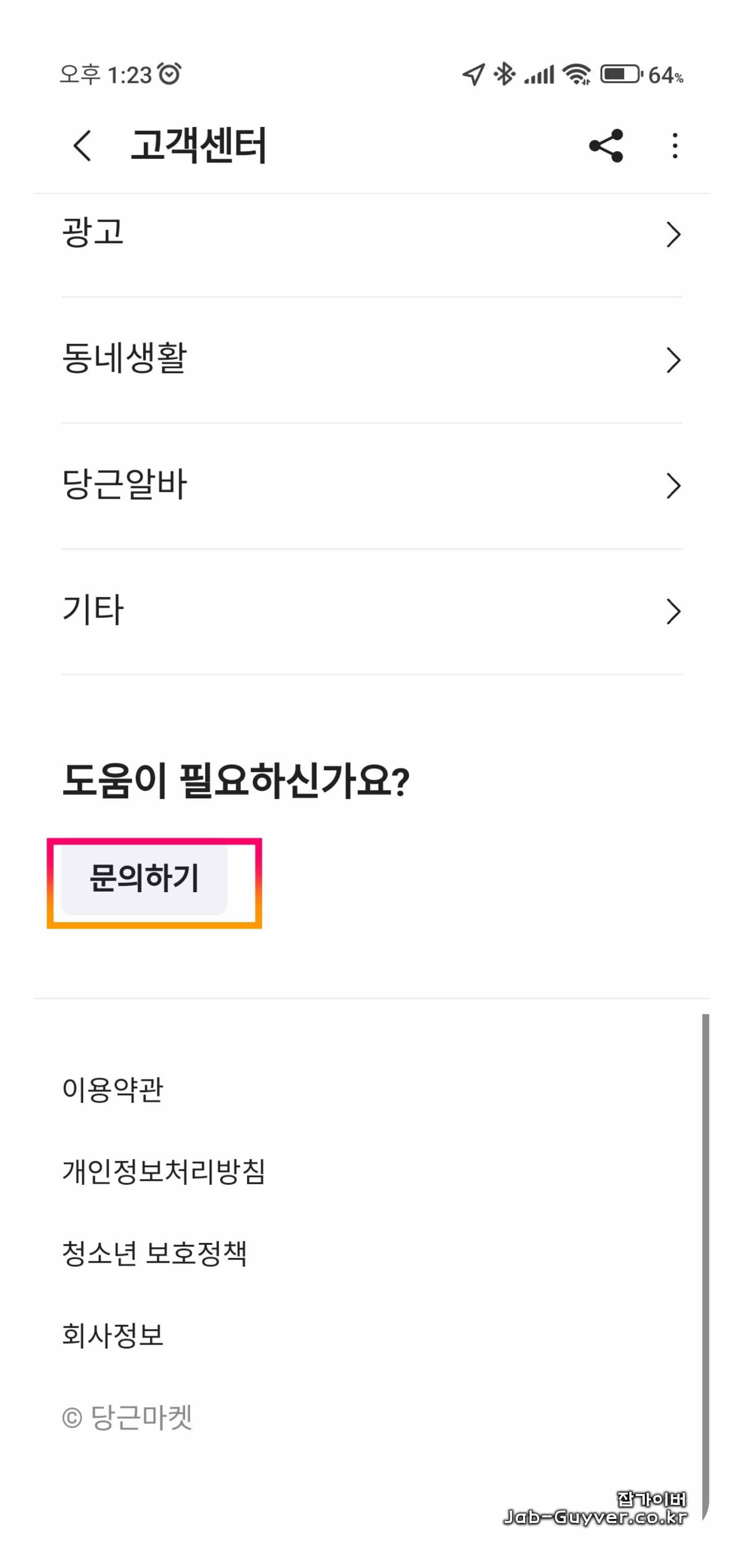 1. `나의 당근` > `자주 묻는 질문` > `고객센터에 문의하기`로 이동합니다.