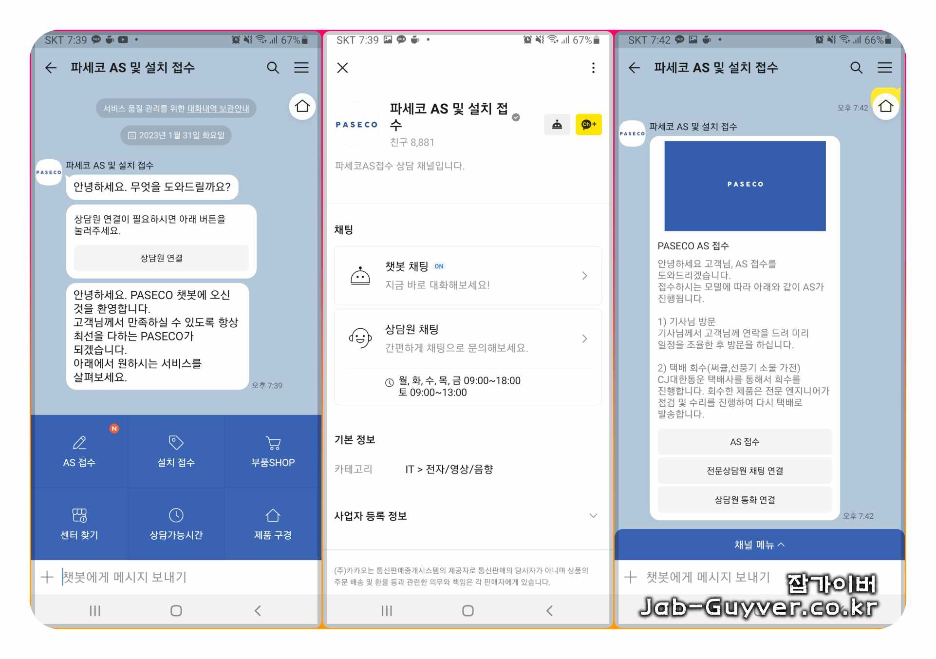 파세코 제품 A/S나 상담이 필요한 경우, 카카오톡 채널을 통해 챗봇 채팅 및 상담원 채팅 문의와 A/S 접수를 할 수 있습니다.