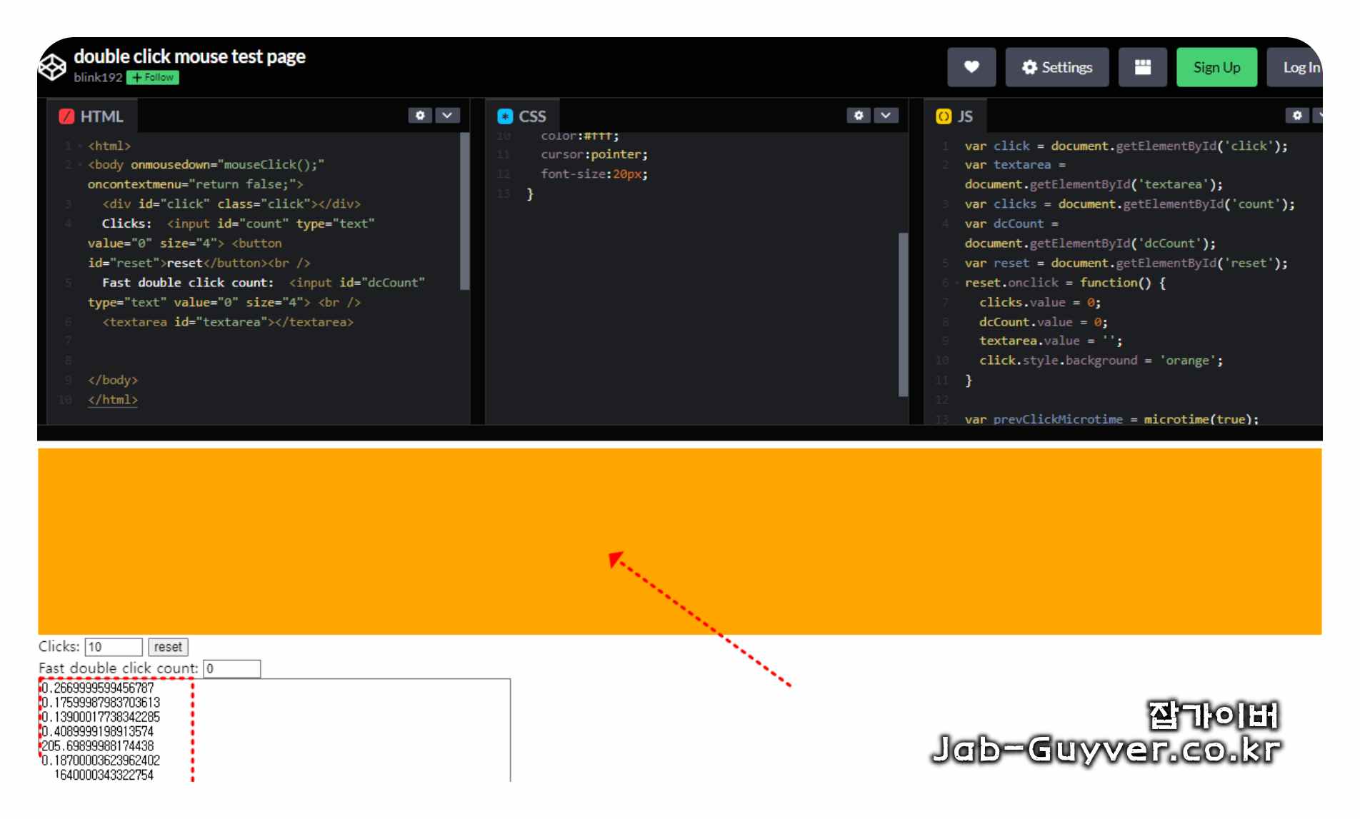 노란 부분을 주기적으로 클릭하는 마우스 더블클릭 테스트 사이트에 접속 후 빠른 속도로 노란색 영역을 더블클릭이 발생한다면 노란 부분이 빨간색으로 변경된다면 마우스 더블클릭 버벅임 문제를 의심할 수 있습니다.