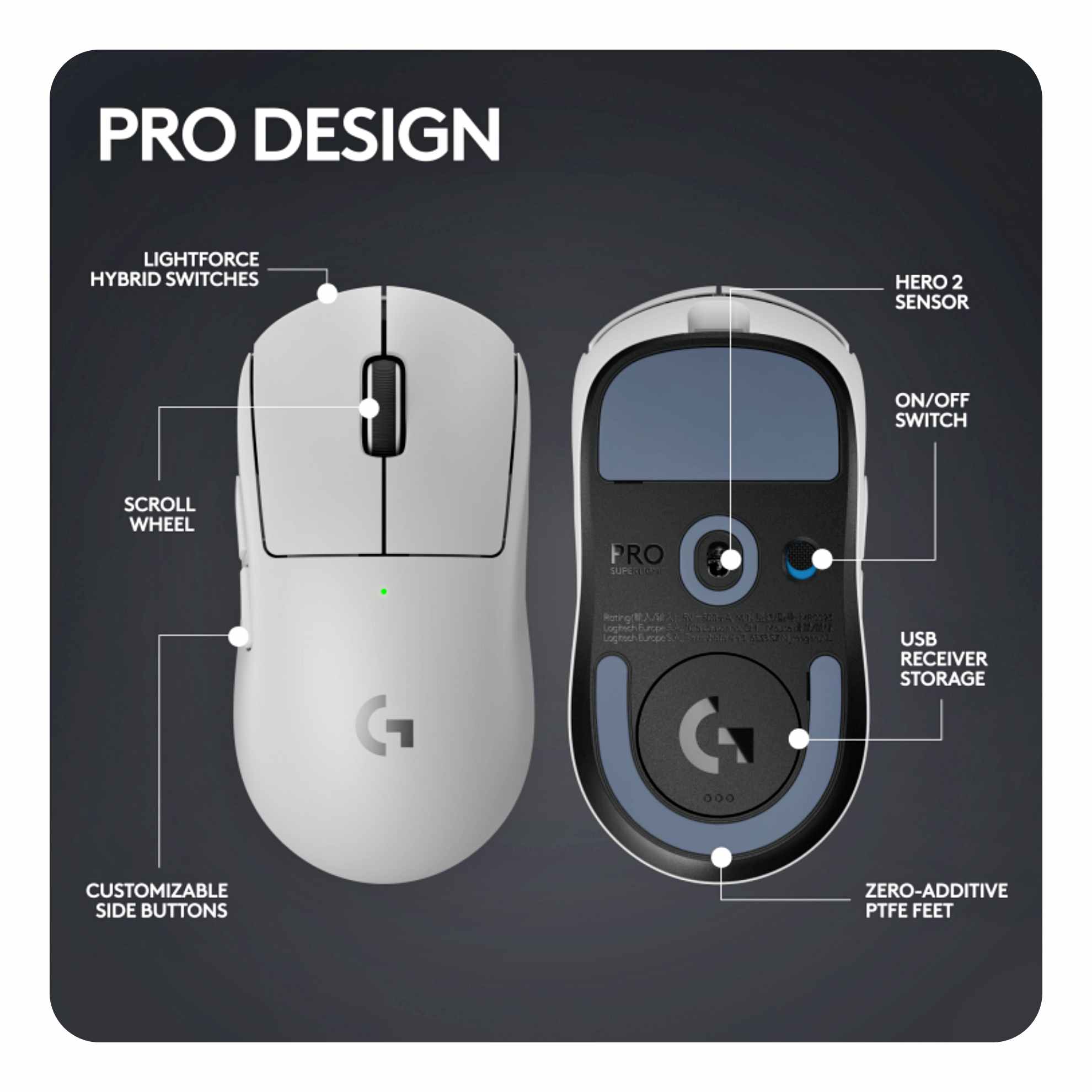 Logitech G Pro X Superlight 2는 세련된 디자인 역시 중요한 업그레이드를 이루었습니다. 강화된 구조와 향상된 손잡이 디자인은 게임 플레이 중 더욱 편안하고 정확한 조작을 도와줄 것입니다.