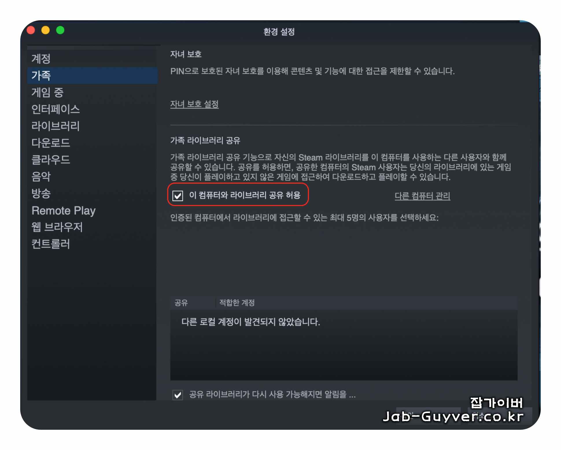 2. 호스트 계정에서 [Steam] - [설정] - [가족]으로 이동해 [컴퓨터와 라이브러리 공유 허용]을 활성화합니다.