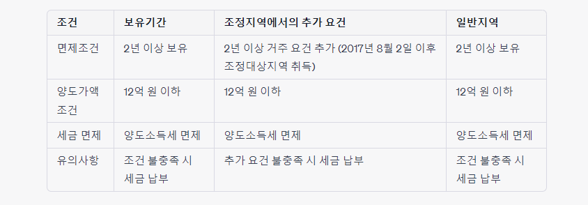 | 면제조건 | 2년 이상 보유 | 2년 이상 거주 요건 추가 (2017년 8월 2일 이후 조정대상지역 취득) | 2년 이상 보유 |
