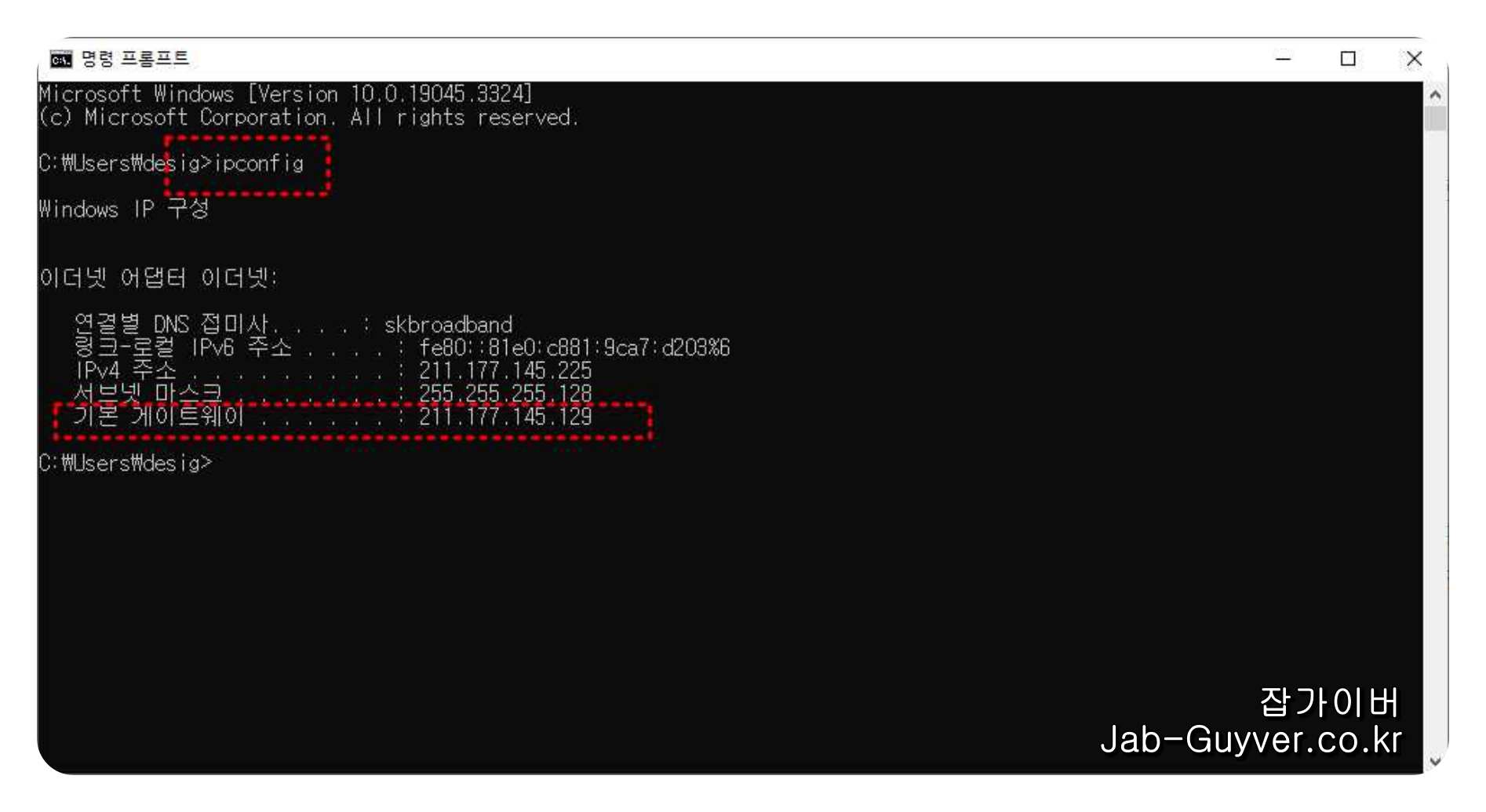 나오는 결과값 중에서 무선 LAN 어댑터에 있는 "기본 게이트웨이" 값을 확인합니다.