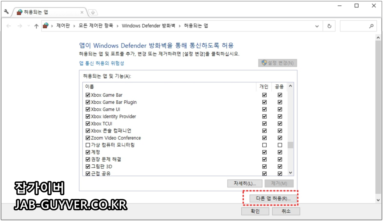 카카오톡이 목록에 없다면 '다른 앱 허용' 버튼을 클릭하여 카카오톡 실행 파일을 추가 한 카카오톡 실행파일인 아래경로를 추가해서 방화벽차단을 해제합니다.
