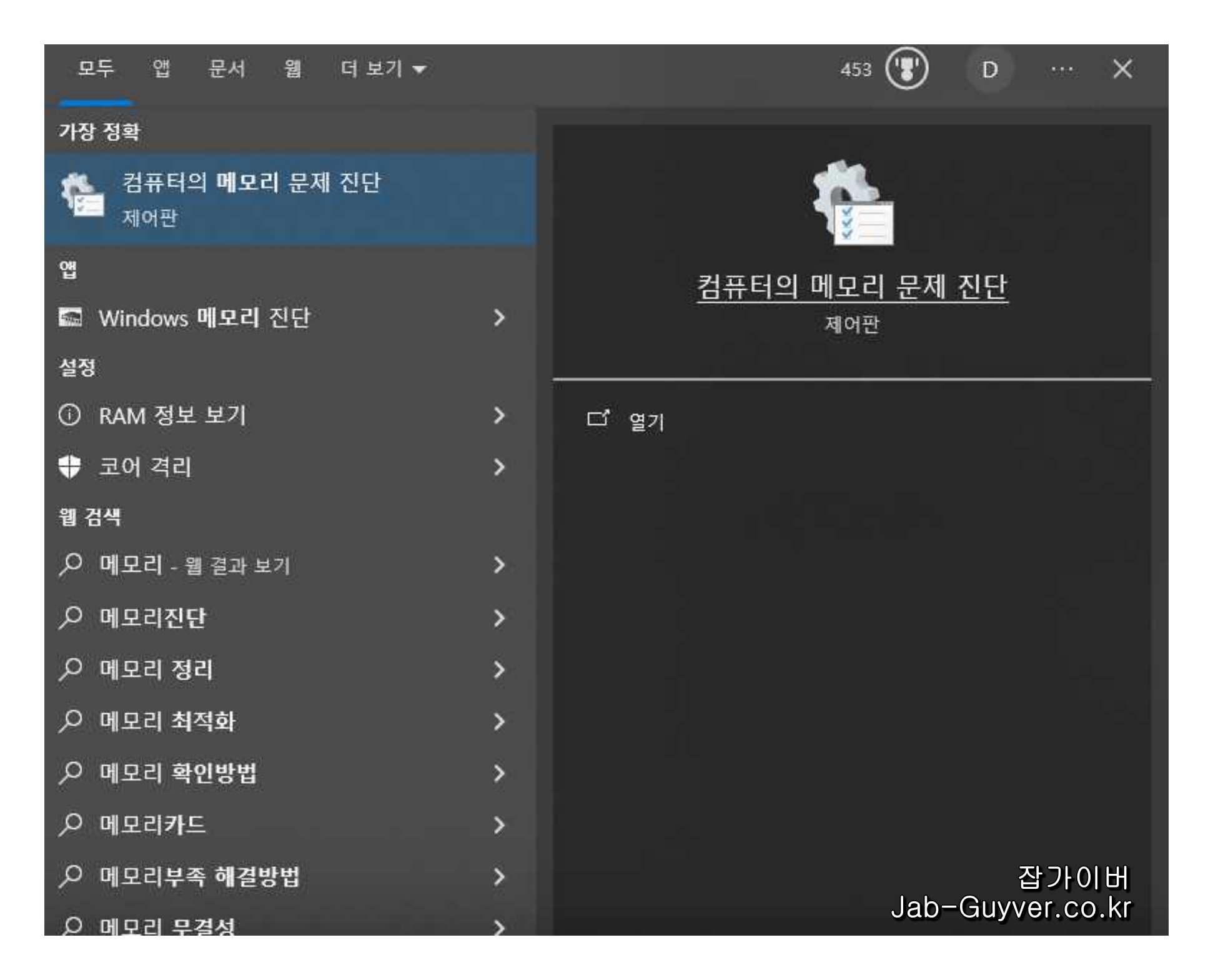 윈도우 검색창에 컴퓨터의 메모리 문제 진단을 실행한 뒤 진행에 따라 테스트합니다.
