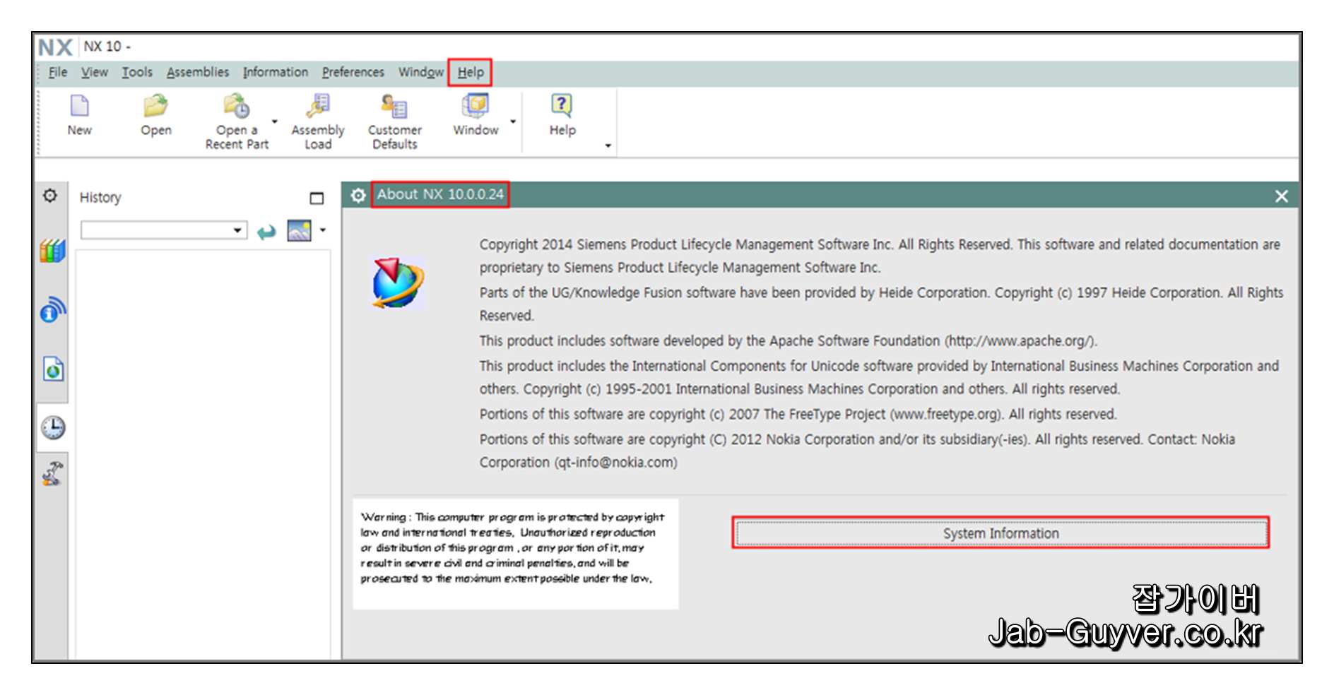 현재 설치된 ug nx 버전의 패치는 Help의 About으로 들어가면 NX Version 및 Patch 버전을 확인할 수 있습니다.