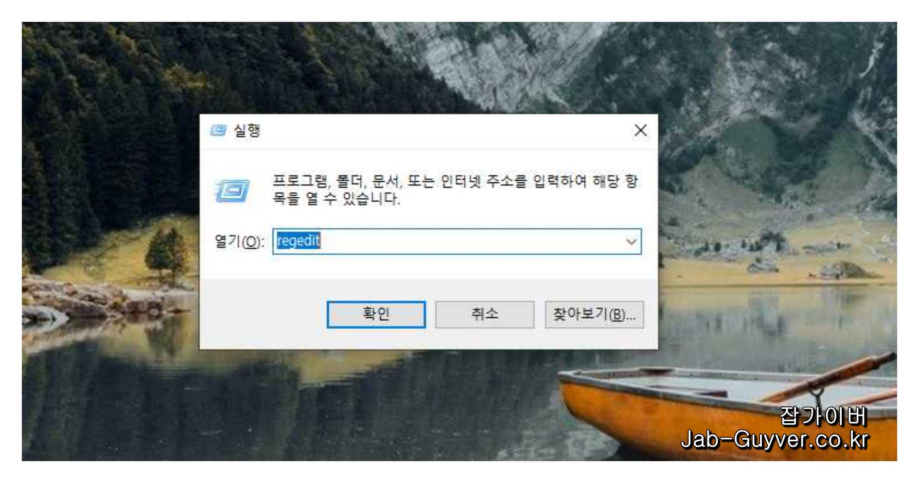 윈도우 키 + R을 눌러 실행창에서 "regedit" 입력 후 확인을 눌러 레지스트리편집기를 실행합니다.