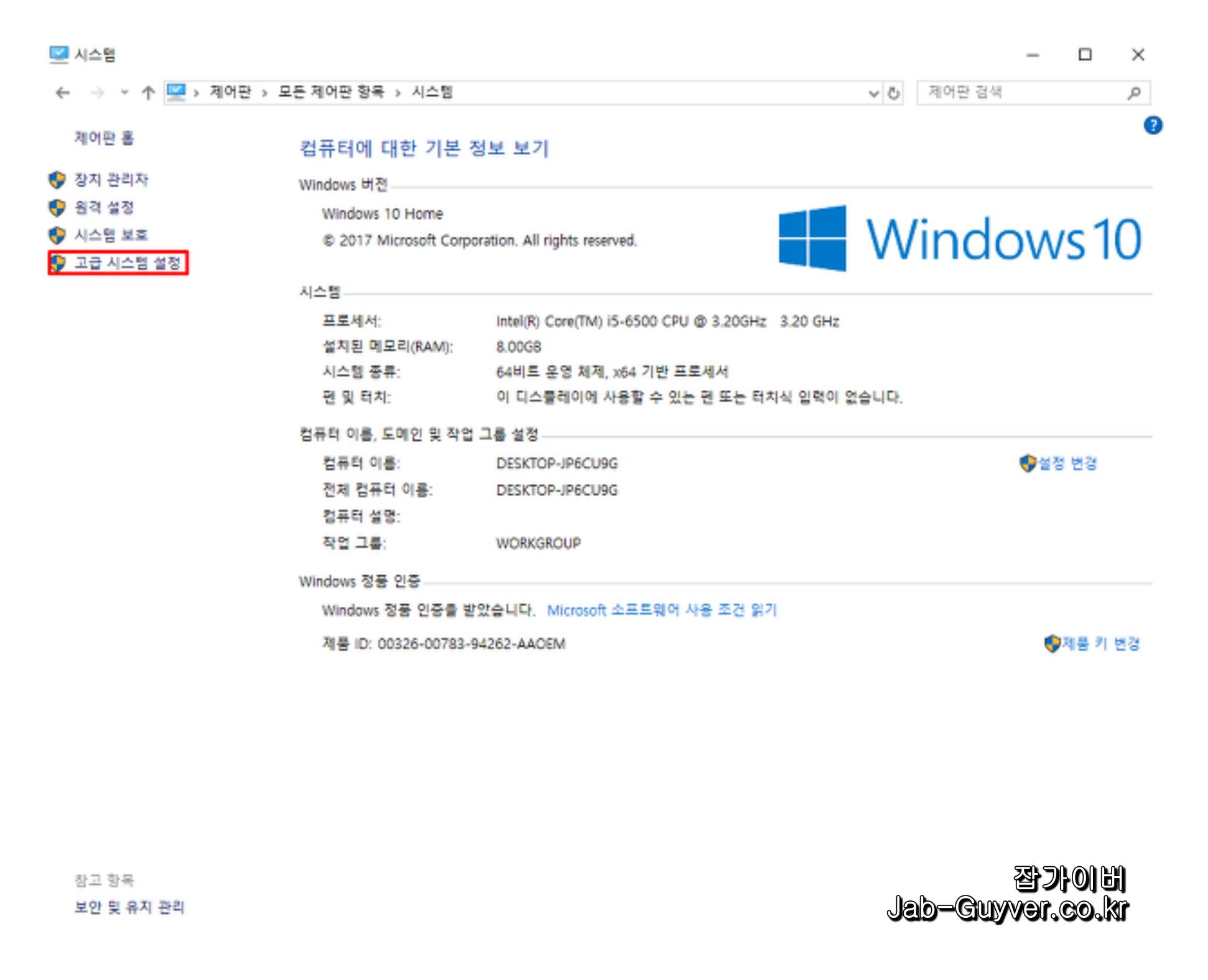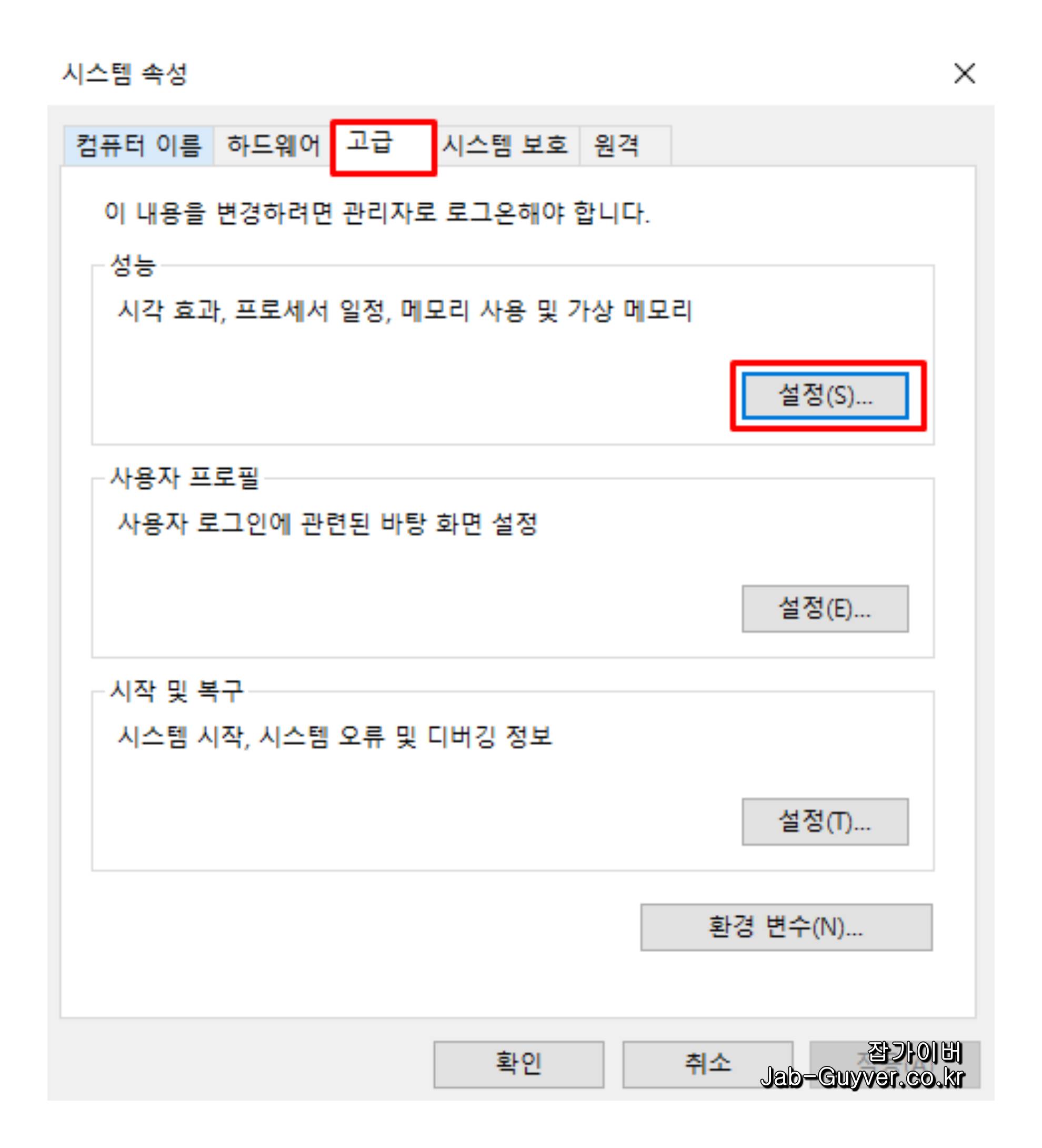 "제어판"으로 들어가서 "시스템 및 보안" 또는 "시스템"을 선택한 후 "고급 시스템 설정"을 클릭하세요.