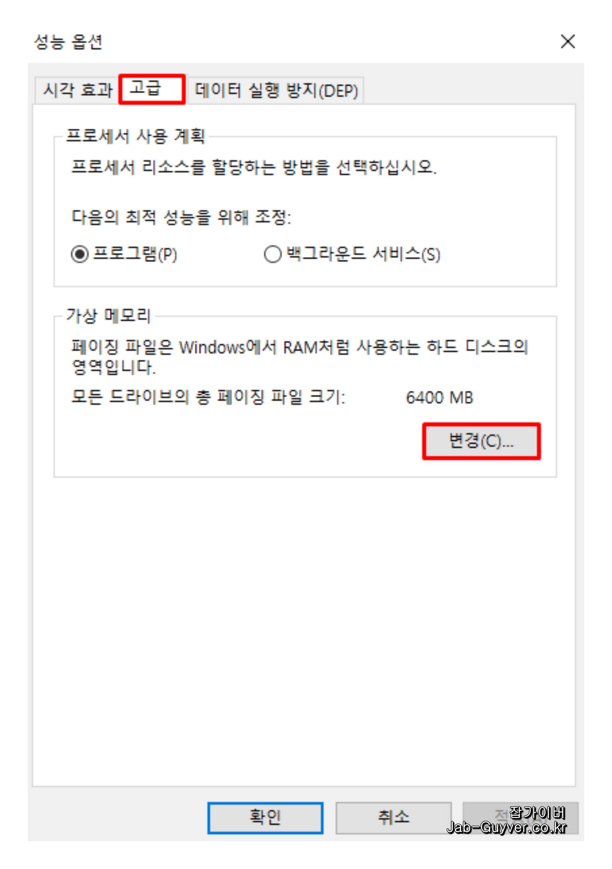 여기서 가상 메모리 설정을 확인하고, "시스템이 관리하는 크기"로 설정하는 것이 좋습니다.