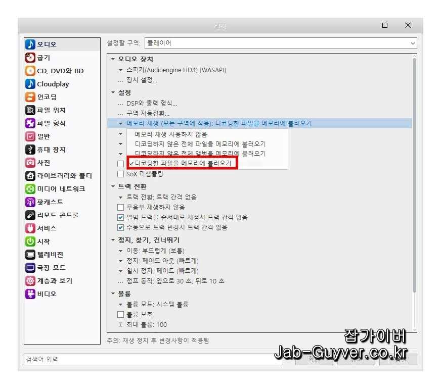 | 출력 모드 | 도구 → 옵션 → 오디오 | 사용하는 오디오 장치 방식 설정 (직접/전달 방식) | WASAPI (USB DAC 사용 시) / DirectSound (일반 스피커) |