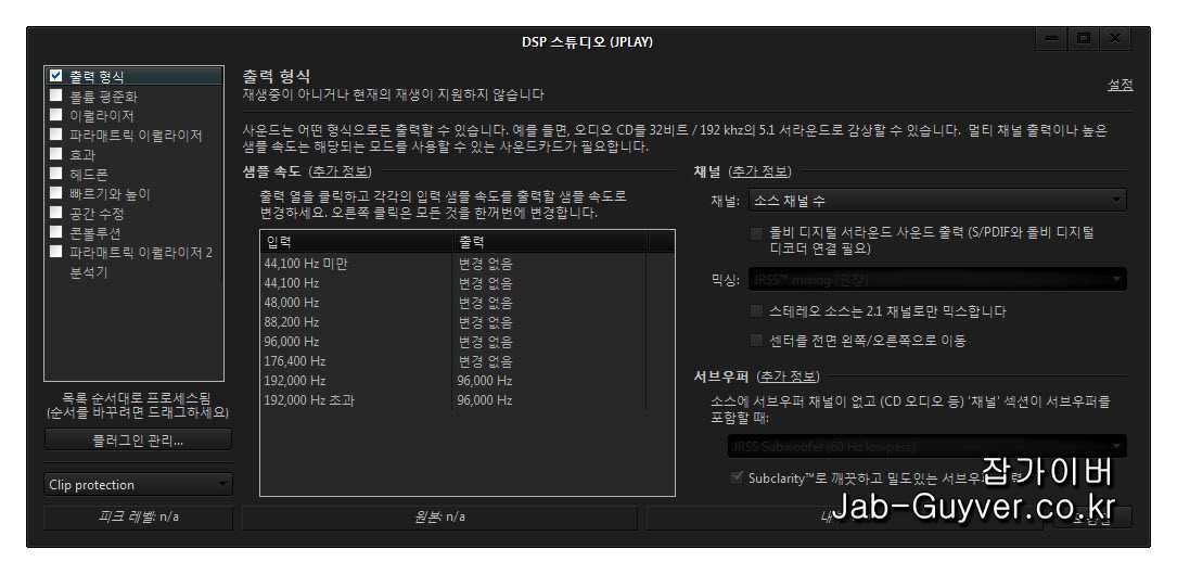 DSP 스튜디오 설정: 필요한 경우 DSP 설정을 통해 출력 형식과 샘플 속도를 조정할 수 있습니다.