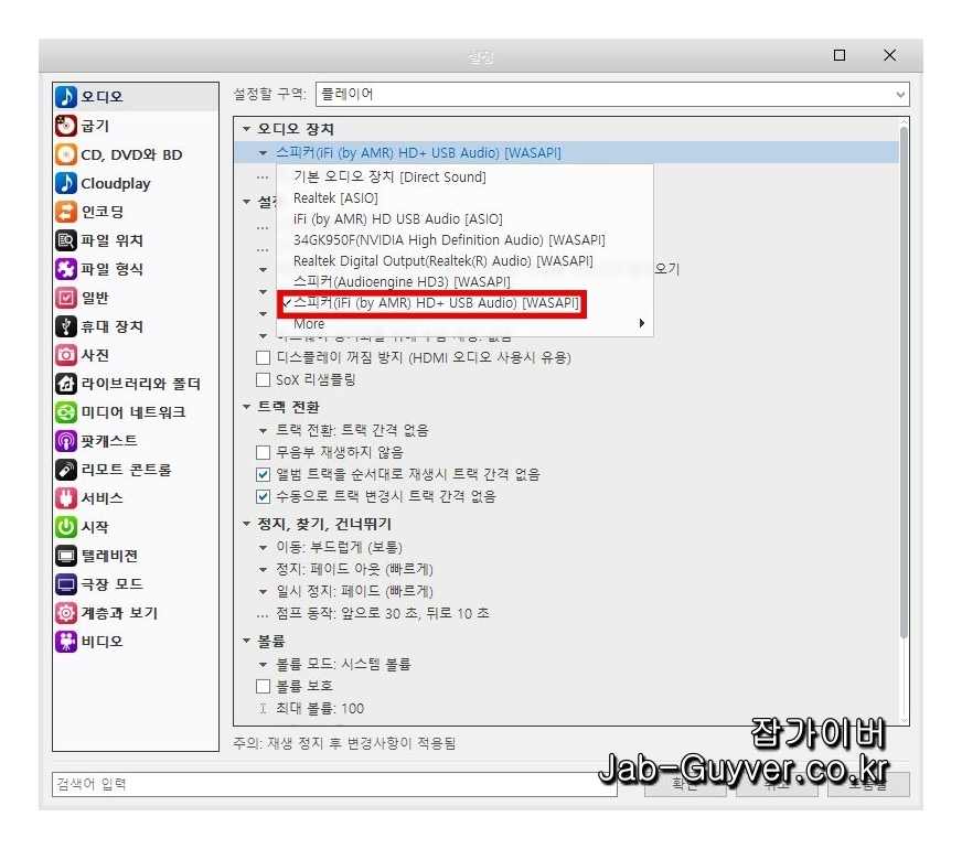 일반적으로 스피커 또는 헤드셋을 사용하는 경우 WASAPI 출력모드를 선택하고 스피커 또는 헤드셋의 최대 스펙에 맞게 설정합니다.