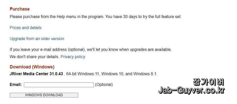 제이리버의 경우 J.River Media Center는 공식 홈페이지에서 다운로드 가능합니다. 사용 전에 먼저 한 달의 체험판을 이용해보는 것을 권장합니다. 그 후 라이선스를 구매하실 수 있습니다.