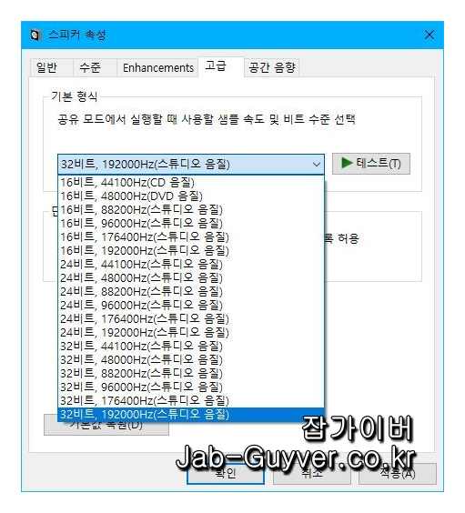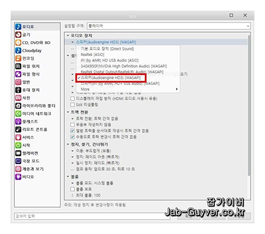 일반적으로 스피커 또는 헤드셋을 사용하는 경우 WASAPI 출력모드를 선택하고 스피커 또는 헤드셋의 최대 스펙에 맞게 설정합니다.