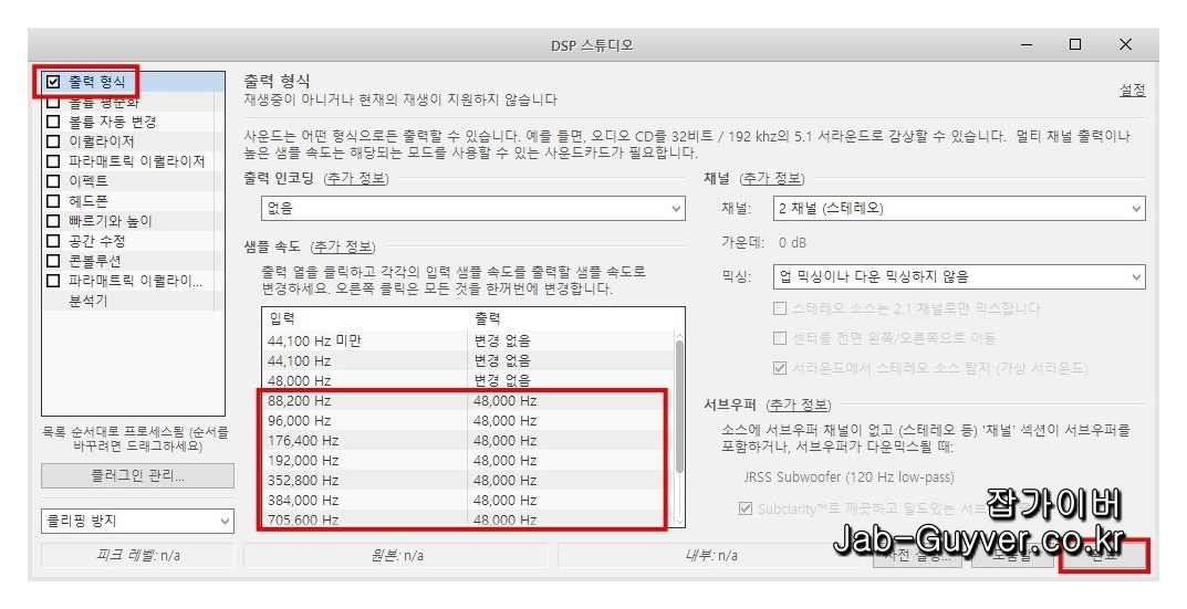 DSP 스튜디오 설정: 필요한 경우 DSP 설정을 통해 출력 형식과 샘플 속도를 조정할 수 있습니다.