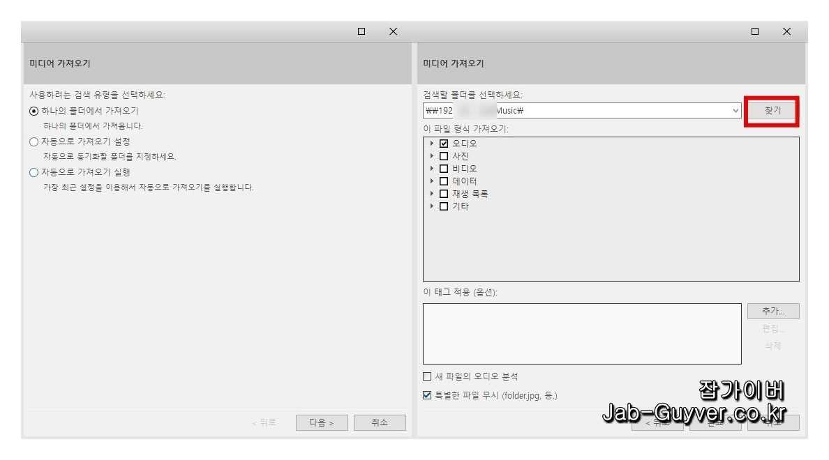 미디어 가져오기 창에서 음악 파일이 저장된 폴더를 지정하고 네트워크 주소나 찾기를 통해 NAS에 저장된 음악 파일도 라이브러리에 추가할 수 있습니다.