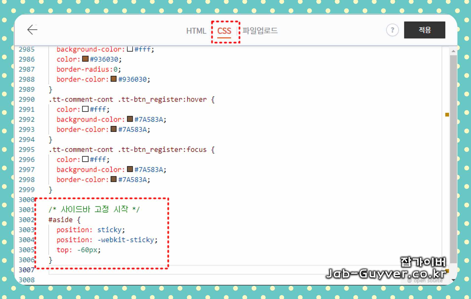 그래서 마우스 스크롤을 해도 애드센스 광고가 아래로 내려가지 않도록 고정하기 위해서는 HTML 에서 CSS에 아래코드를 추가해줍니다.