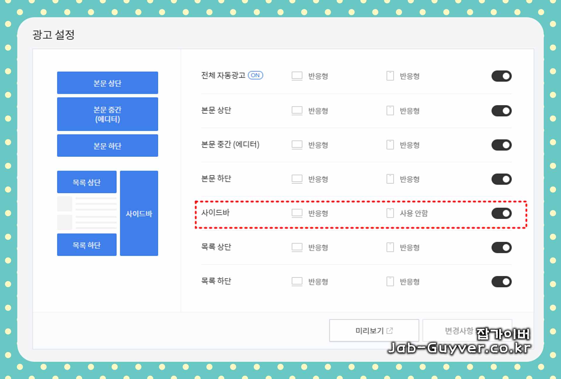 하지만 자동으로 애드센스 광고를 설정하지 않고 사이드바에 원하는 광고를 고정해서 설정할 수 있습니다.
