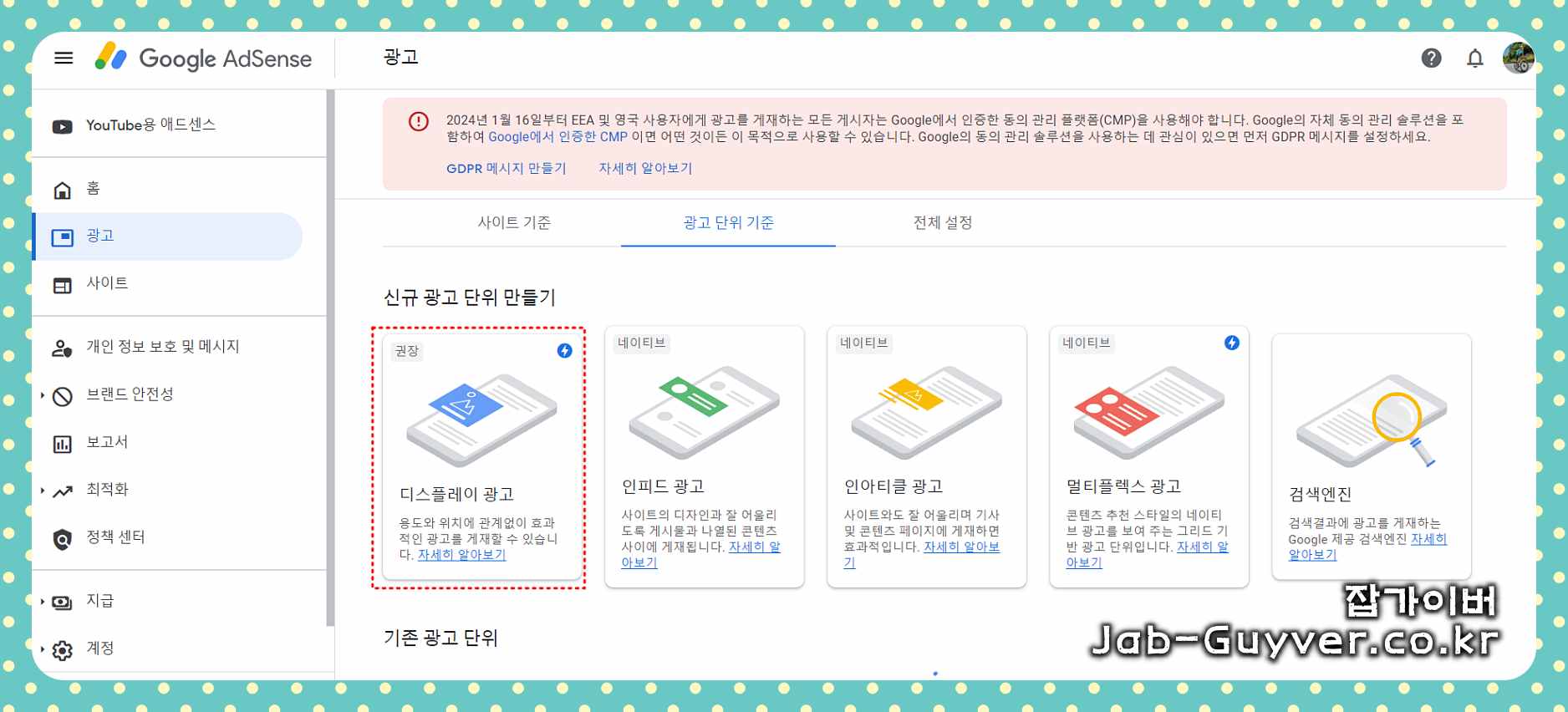 애드센스 사이드바에 광고를 노출할 때는 큰 스카이스크래퍼 300 x 600 사이즈를 추천하며 2023년 기준 디스플레이 광고를 선택 해 원하는 사이드바 수평광고로 설정해도 됩니다.