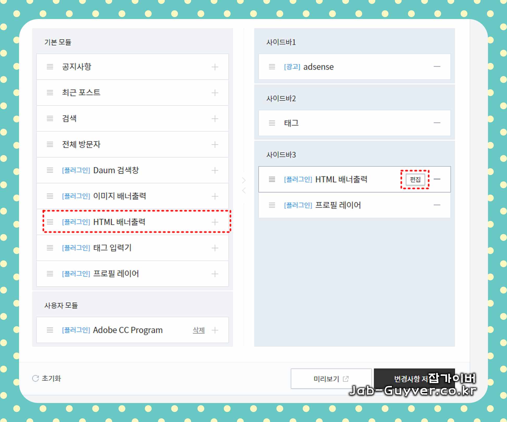 추가한 배너출력 항목을 우측으로 이동시켜 배너를 활성화합니다.