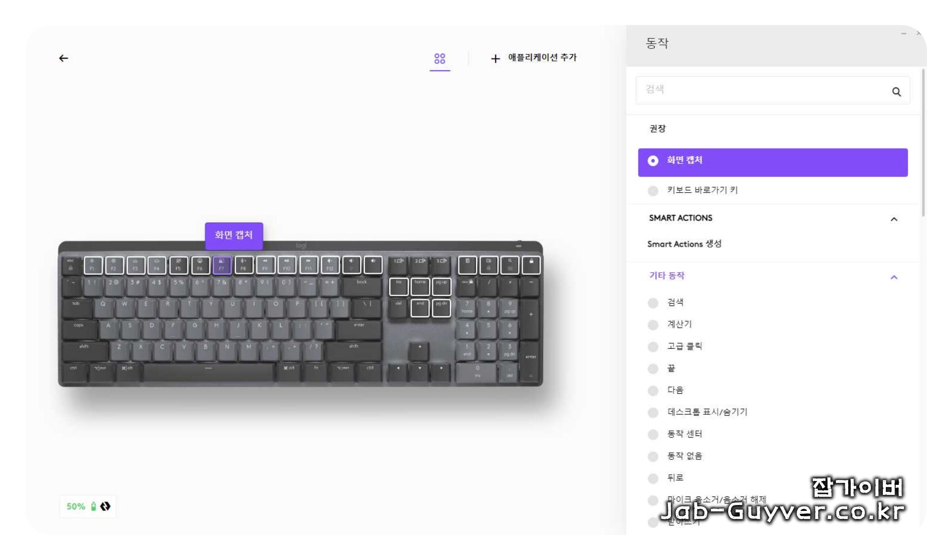 앱을 통해 로지텍 기계식 무선 키보드의 배터리 잔량을 확인할 수 있으며, 키보드의 백라이트 효과나 각 Fn 키의 기능을 설정 및 변경할 수 있습니다. 또한, 키보드의 펌웨어 업데이트와 다양한 기본 설정 버전을 확인할 수 있습니다.