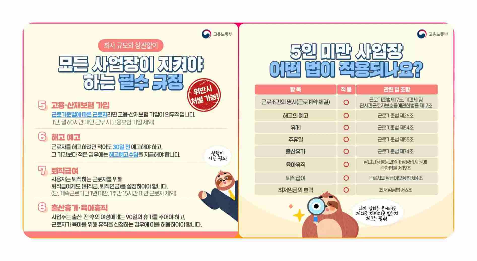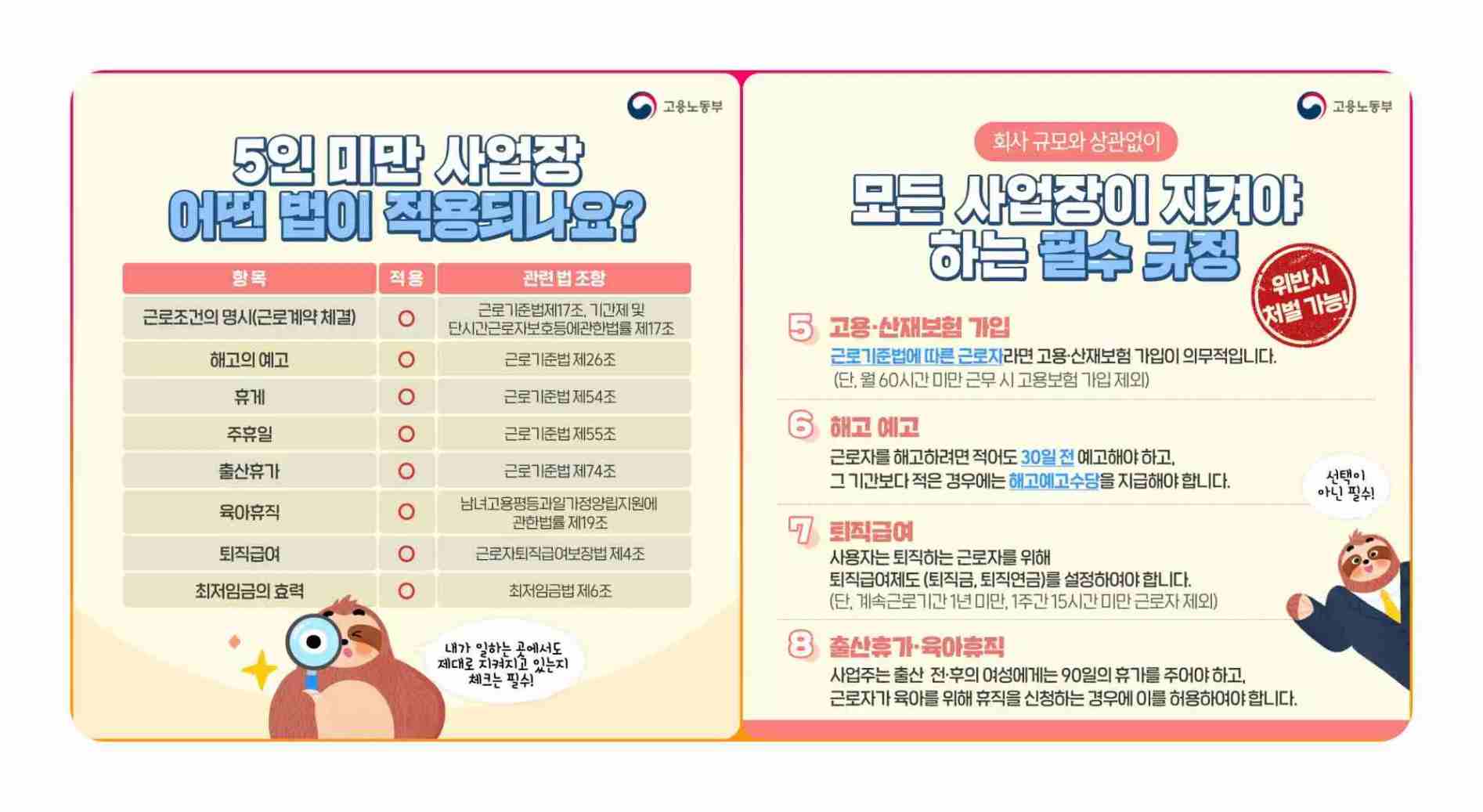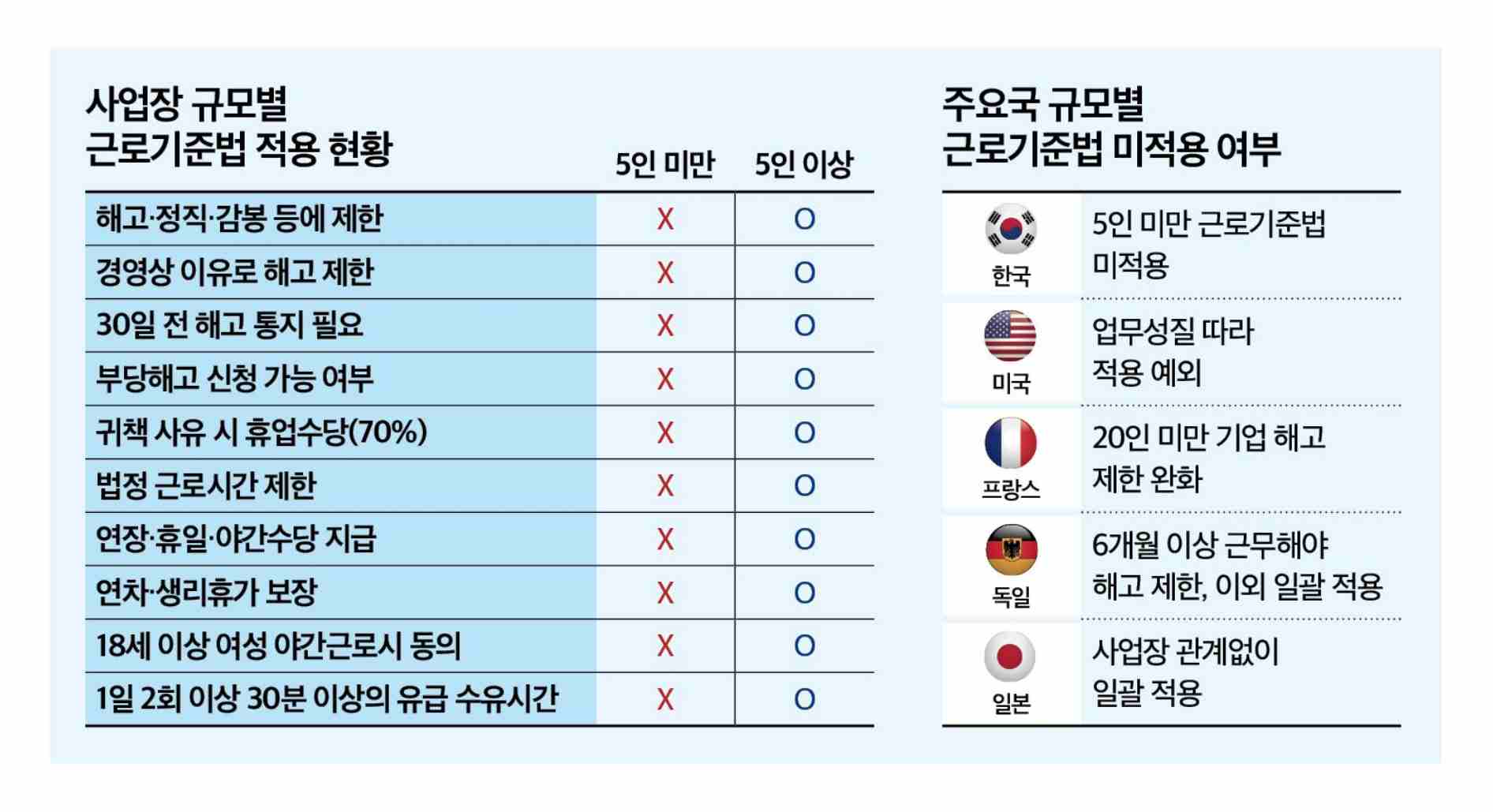 | 사업장 규모 별 근로기준법 적용 | 5인 미만 기업 | 5인 이상 기업 |