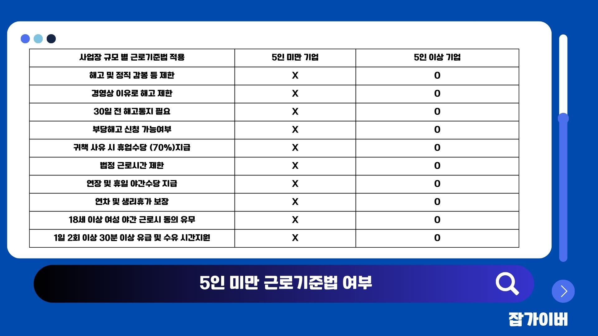 사업장 규모 별 근로기준법 적용 | 5인 미만 기업 | 5인 이상 기업 |