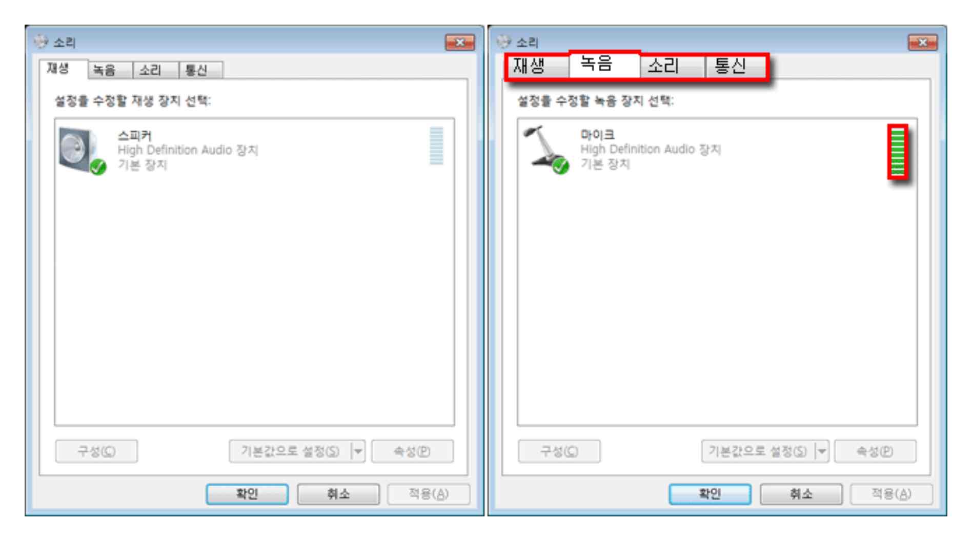 이후 '녹음' 탭으로 이동하여 마이크 설정을 '사용'으로 바꾼 뒤, 여전히 문제가 해결되지 않는다면 '기본 장치'로 설정을 변경하시면 대부분의 문제가 해결될 것입니다.