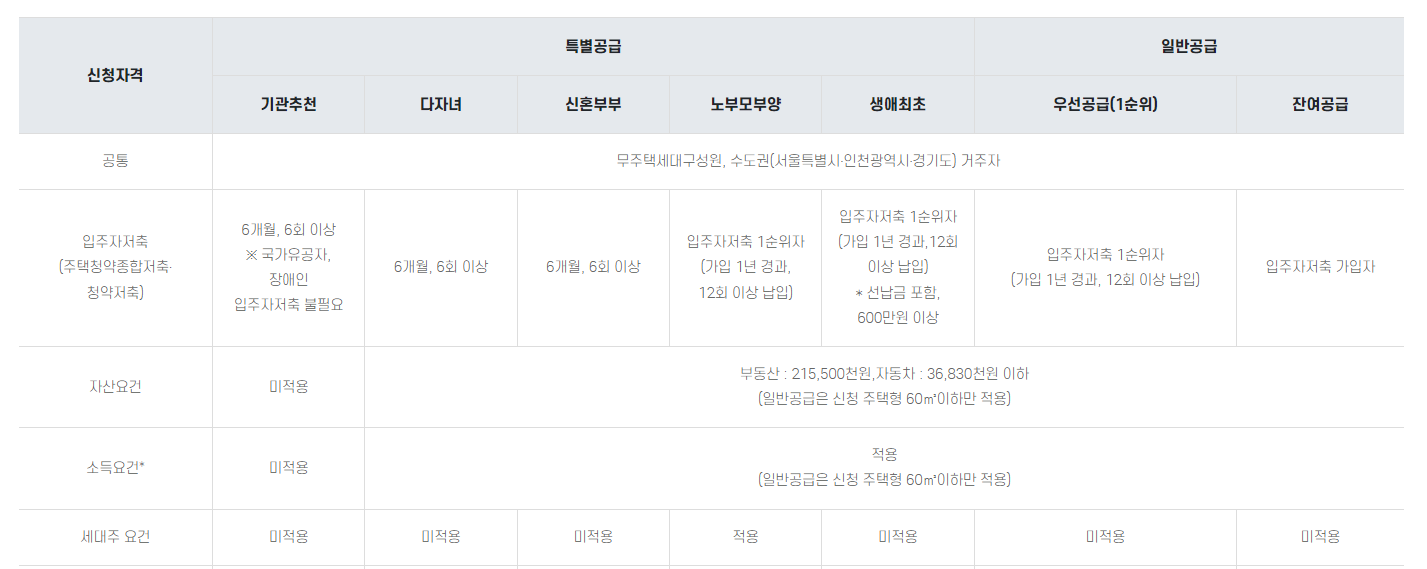 • 생애최초 특별공급: 이 프로그램은 주로 무주택자 중에서 자녀가 있는 경우, 혹은 자녀가 없지만 소득세를 5년 이상 납부한 경우에 해당합니다. 무주택자 중에서 혼인 기간이나 자녀 유무와 상관 없이 주택 구입을 처음 시도하는 사람들을 지원합니다.