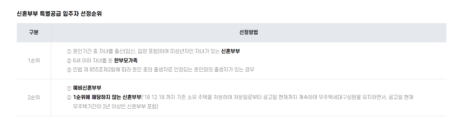 위의 두 가지 요건을 충족하면 신혼부부 특별공급 1순위로 선정됩니다. 이러한 요건을 충족하지 못할 경우 2순위로 밀려날 수 있으며 아래 6가지 선정기준을 참고하세요