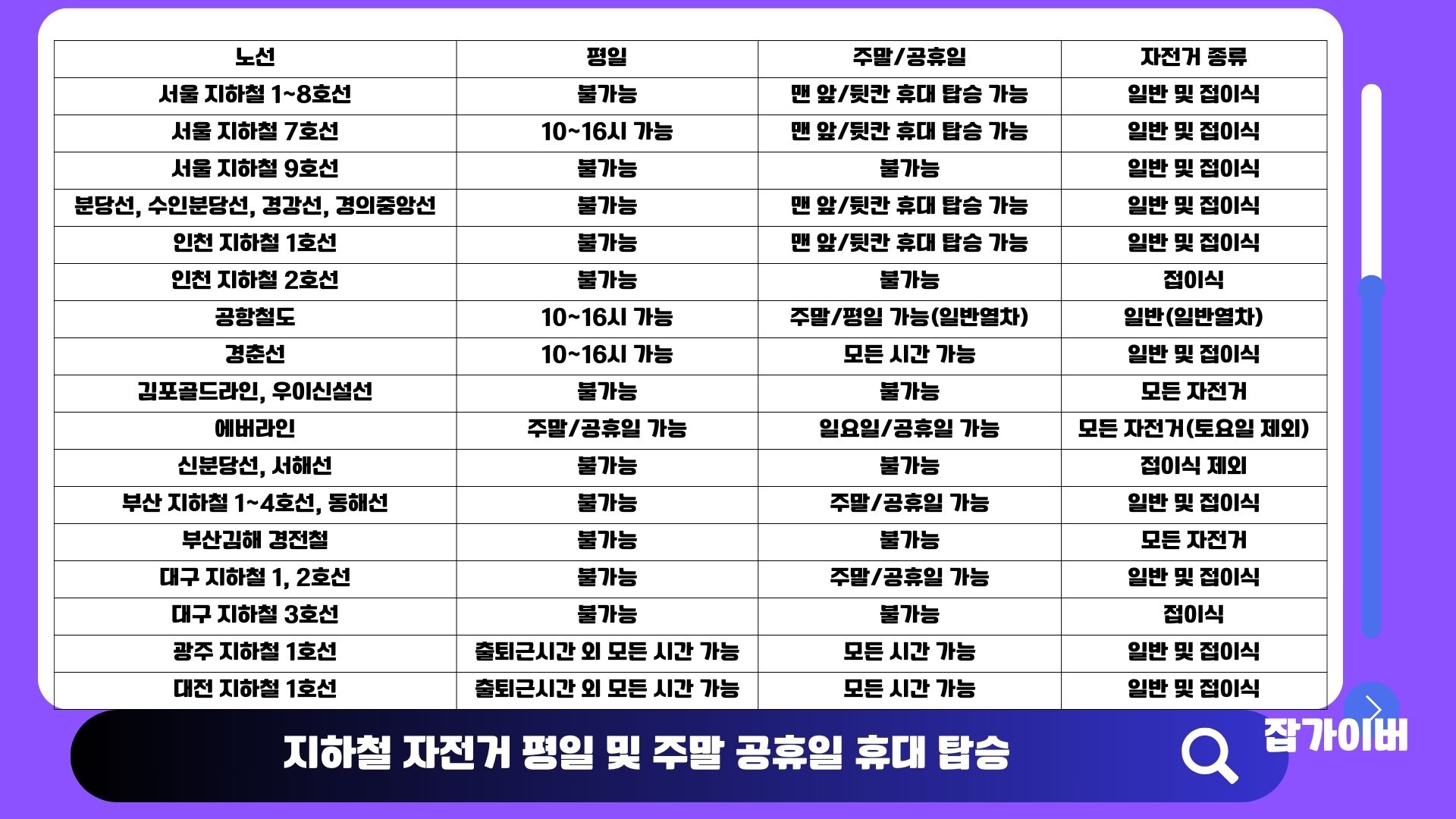 | 지하철 호선 | 접이식 자전거 휴대승차 | 일반 MTB, 로드 사이클 ( 주말 및 공휴일) |