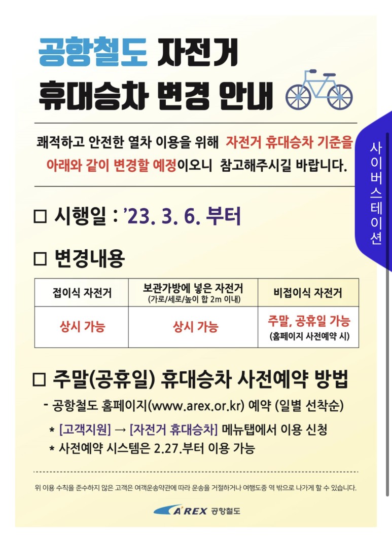 공항철도의 경우, 접이식 자전거는 상시로 탑승 가능하며 비접이식 자전거는 주말과 휴일에만 예약을 통해 탑승할 수 있습니다.